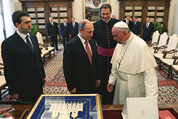 В рамках поездки президента РФ Владимира Путина в Рим в Ватикане в среду состоялась встреча главы российского государства и папы Римского Франциска. Во дворе апостольского дворца главу российского государства встретил почетный караул швейцарских гвардейцев и наместник двора понтифика. В сопровождении джентльменов папского двора — светских служителей Ватикана — В.Путин вместе с представителями российской делегации проследовал ко входу в личную папскую библиотеку, где президента встретил папа Франциск: журналисты наблюдали протокольную часть встречи, которая с некоторым отставанием от временного графика прошла в самой библиотеке. После беседы с понтификом, которая продолжалась больше часа, В.Путин представил папе Франциску каждого из членов делегации.