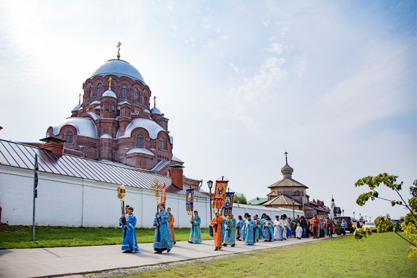 По окончании богослужения духовенство и верующие, по доброй традиции, прошли по улочкам Свияжска крестным ходом с пением молитвословий Пресвятой Богородице, останавливаясь возле храмов, взорванных в годы гонений.