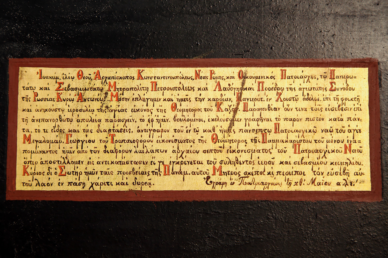 И только в прошлом году – во время съемок документального фильма «Первоявленная» о Казанской иконе Божией Матери, у исследователей впервые появилась возможность воочию увидеть и запечатлеть чудотворный образ «Всеблаженной». На оборотной стороне иконы сохранилась дарственная надпись Константинопольского патриарха Иоакима, которая гласит: «Иоаким, Божиею милостию архиепископ Константинополя, Нового Рима, и Вселенский патриарх, преосвященнейшему и честнейшему митрополиту Петербургскому и Ладожскому и предстоятелю Святейшего Синода российского, господину Антонию. Преосвященнейший о Христе собрат! И мы до глубины сердца были поражены страшным и неслыханным святотатственным похищением святой Казанской иконы Богоматери. Поэтому, желая со своей стороны доставить благочестивым христианам некоторое утешение в невознаградимой утрате, мы велели написать настоящий верный во всем по виду и по размеру список с иконы Богоматери «Всеблаженной», находящейся в почитаемом всеми у нас патриаршем храме святого великомученика Георгия Победоносца, – единственной, оставшейся у нас от различных разграблений и издревле почитаемой иконы патриаршего храма; каковой список и посылаем для поставления, если соблаговолите, вместо похищенного, священного и почитаемого сокровища. Господь же Спаситель наш молитвами Своей Матери да осеняет и охраняет благочестивый народ свой всякой благодатию и милостию. Написано в патриархии 29 мая 1905 года».