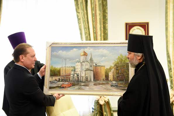 В начале встречи владыка Пармен подарил Айдару Метшину картину с изображением одного из казанских храмов.