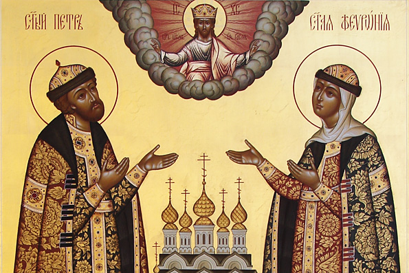 Святой благоверный князь Петр, в иночестве Давид, и святая благоверная княгиня Феврония, в иночество Евфросиния, Муромские чудотворцы. Благоверный князь Петр был вторым сыном Муромского князя Юрия Владимировича. Он вступил на Муромский престол в 1203 году. За несколько лет до этого святой Петр заболел проказой, от которой никто не мог его излечить. В сонном видении князю было открыто, что его может исцелить дочь пчело-вода благочестивая дева Феврония, крестьянка деревни Ласковой в Рязанской земле. Святой Петр послал в ту деревню своих людей.