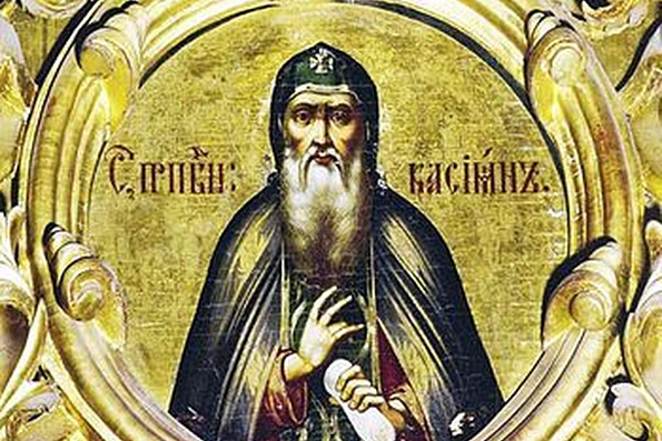 В миру Константин, прибыл в 1473 г. в Москву в составе посольства к великому князю Иоанну III вместе с царевной Софией Палеолог. Решив посвятить свою жизнь служению Богу, преподобный отклонил предложение остаться при дворе великого князя и поселился у Ростовского епископа Иоасафа. Когда епископ удалился на покой в Ферапонтов монастырь, за ним последовал и Константин. В обители преподобный проводил строгую подвижни-ческую жизнь. Приняв постриг, святой Кассиан оставил монастырь и недалеко от города Углича, при слиянии Волги и Учмы, основал обитель в честь Успения Божией Матери.