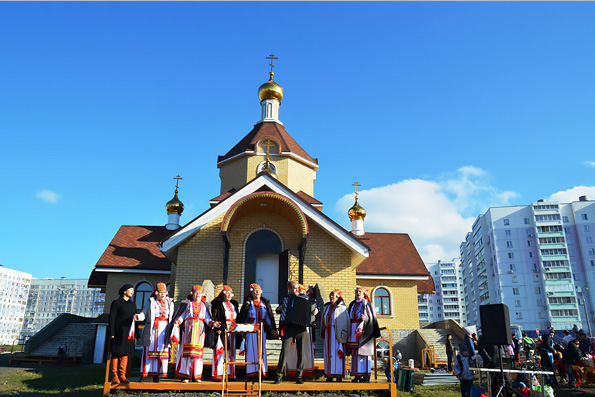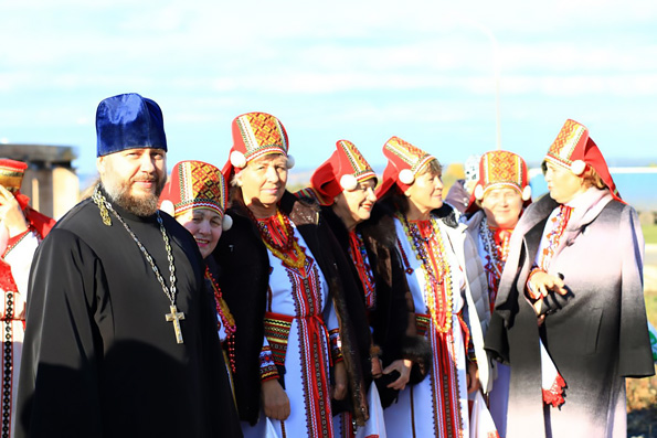 Затем перед собравшимися на импровизированной сцене центрального входа в храм выступил народный мордовский хор «Моро», исполнивший песнопения на мордовском и русском языках.