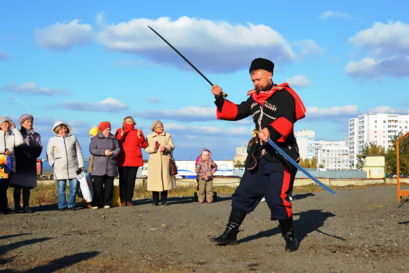 Праздник продолжил атаман Рождественского хутора Руслан Цветков, который исплонил казачьи песни и песни собственного сочинения под аккомпанемент гармони. Под занавес челнинские казаки преподнесли сюрприз, показав, как они владеют шашкой и нагайкой.