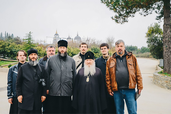 В понедельник после трапезы наша группа отправилась по монастырям. Поднявшись немного вверх, прибыли в Старый Руссик. Так называется место, где располагался русский монастырь с XI по XVIII вв. В соборном храме полным ходом шла внутренняя отделка, его готовили к великому освящению, которое должно состояться в будущем (2016 – прим.) году, когда будет праздноваться 1000-летие присутствия русского монашества на Афоне1.
