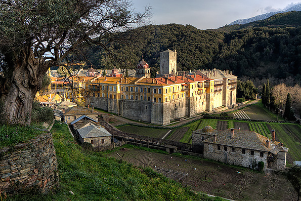 ...Мы плывем вдоль южного берега полуострова Афон. Вот и первая пристань болгарского монастыря Зограф, сама обитель находится в глубине полуострова. На склоне полуострова то и дело появляются одинокие кельи, вокруг которых разбит небольшой огород. Это место подвигов монахов-отшельников.