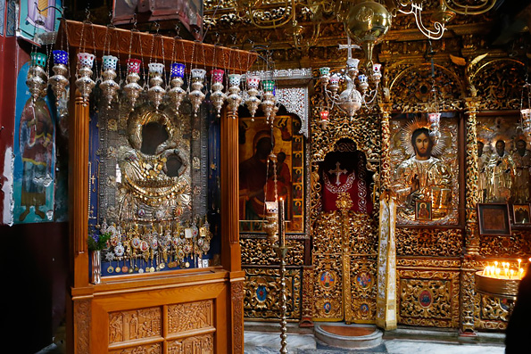 Игумен Евфимий отворил двери братского собора в честь пророка Божия Илии, и нашему взору открылся огромный четырехъярусный резной позолоченный иконостас. Он был изготовлен в России, на позолоту ушло две тонны золота.
