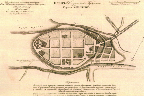 Для Свияжска в конце XVIII века было разработано несколько вариантов регулярного плана (Высочайше утвержденный план относился к 1829 году). Предусматривалось дорегулярную планировку заменить равномерной сеткой кварталов из трех меридиональных улиц и четырех широтных переулков, охваченных по периметру острова набережной-бульваром. Предполагался единственный въезд в город. Новым планом главная площадь с собором делилась скверами и застройкой на несколько зон.