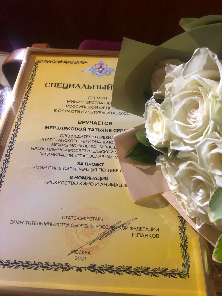 Специальный диплом премии за победу в номинации «Искусство кино и анимации» из рук первого замминистра обороны РФ Руслана Цаликова получила продюсер фильма «Мин сине сагынам», куратор социальной работы Серафимовского прихода Татьяна Мерзлякова. Дипломов удостоен весь авторский коллектив проекта: режиссер Марина Мусиенко, которая также является руководителем Театральной студии «Сказ» при воскресной школе; режиссер Наталья Панкратова, оператор-постановщик Эдуард Лёвочкин, художник по костюмам Анна Павлова, звукорежиссер и композитор Игорь Сиденко.