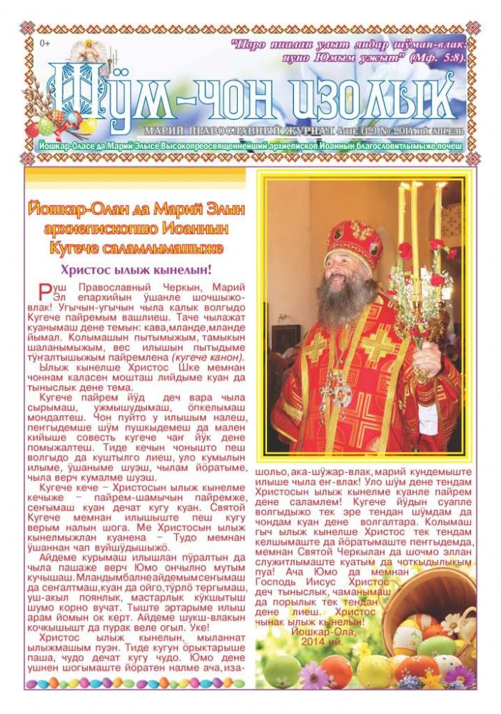 На первой полосе опубликовано Пасхальное послание архиепископа Йошкар-Олинского и Марийского Иоанна к верным чадам Русской Православной Церкви Йошкар-Олинской епархии. Владыка подчеркивает величие праздника Христова Воскресения и со всей сердечностью восклицает: «Христос Воскресе!» Также читателям журнала раскрывается смысл евангельских событий: Благовещения Пресвятой Богородице и Вход Господень в Иерусалим.