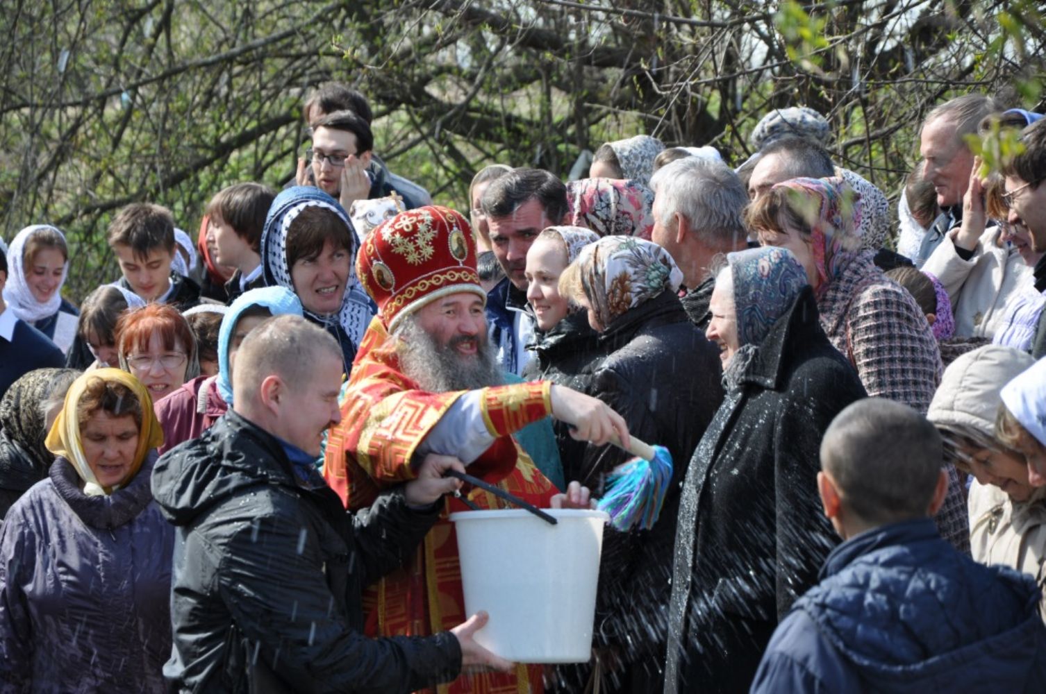 На источнике был отслужен водосвятный молебен Божией Матери. Верующие осенялись Мироносицким образом Божией Матери, после чего Владыка Иоанн окропил святой водой каждого, кто проходил под иконой.