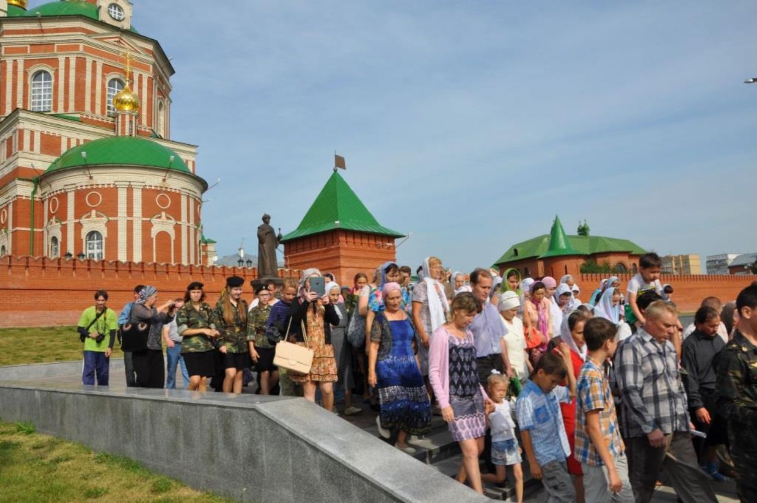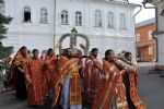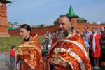 На эту службу собрались молодые прихожане из всех благочиний епархии. После завершения богослужения начался крестный ход. Он прошел по набережной до строящегося Благовещенского собора, где отслужили молебен, и Владыка щедро окропил всех святой водой. А дальше через Спасскую башню прошли на Патриаршую площадь, где у памятника Святейшему Патриарху Алексию отслужили литию. Затем крестный ход вернулся в епархию.