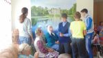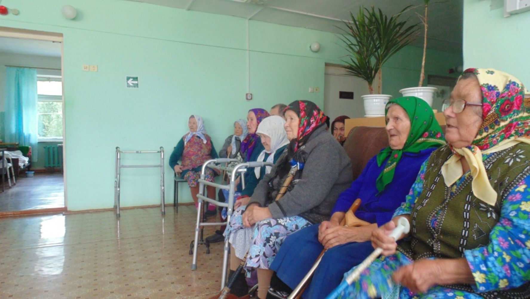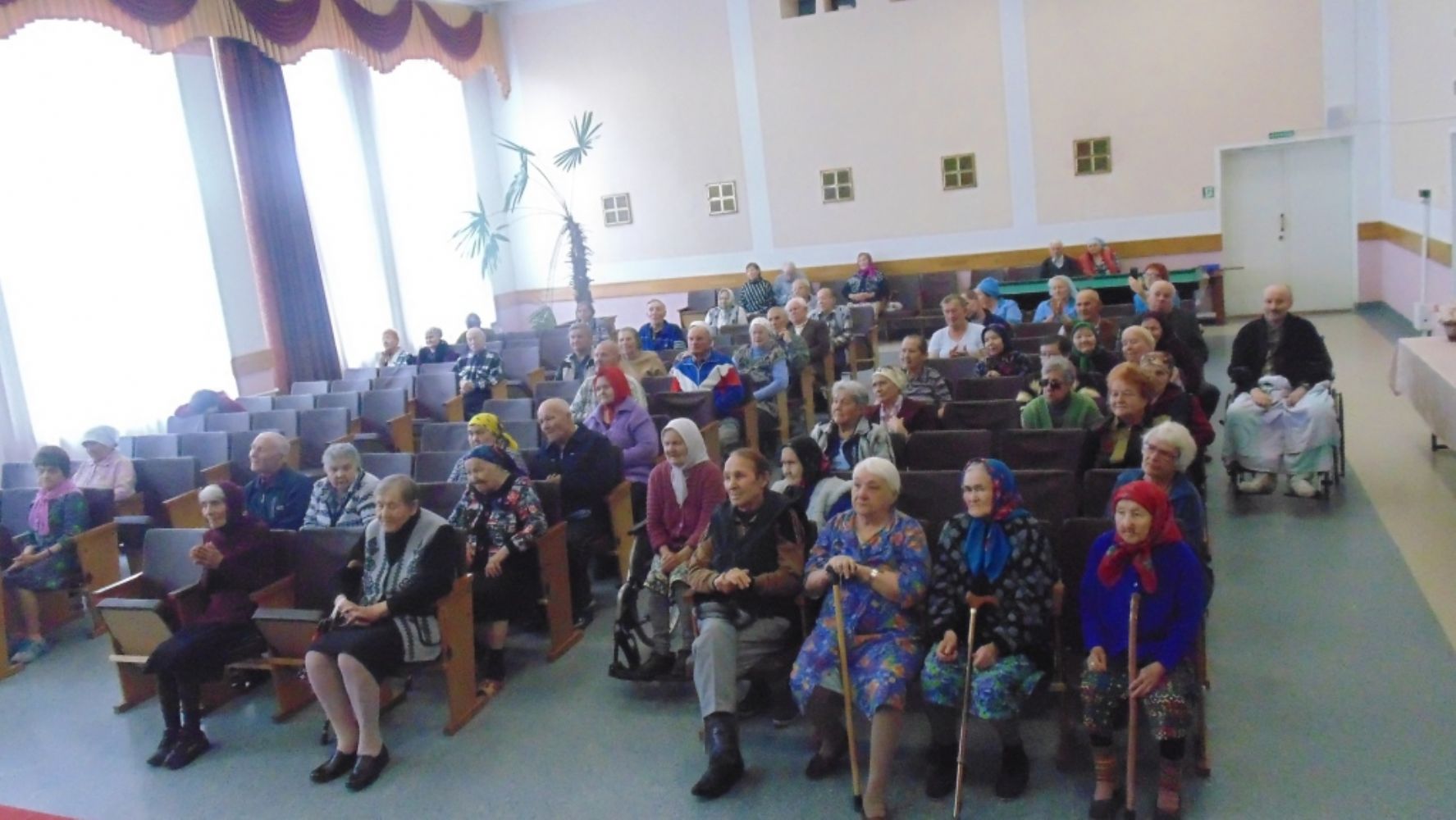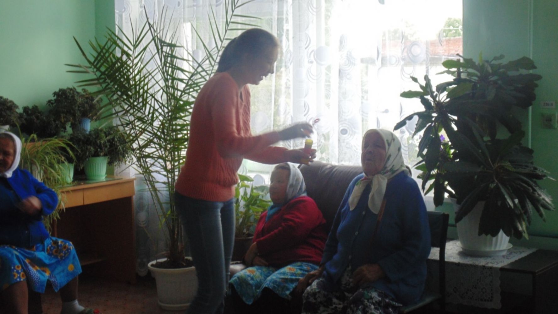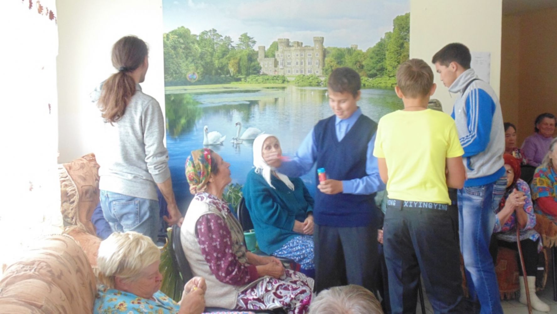 Традиционно, встреча начинается с приветствия. Все знакомятся. Затем для подопечных учреждения показывается небольшая сценка, поют песни, раздают конфеты (кому можно). Интересный момент: ребята предлагают пожилым людям выдувать мыльные пузыри. Проводятся игры с шарами. Главная составляющая — живое общение, беседа с бабушками и дедушками, для которых оно так важно.