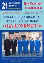На концерте, посвященном празднику Рождества Богородицы и 20-летия прихода п. Медведево, выступит вокальный ансамбль духовной музыки «Благовест», под руководством Елены Калиткиной. Концерт состоится в 17.00, вход свободный.