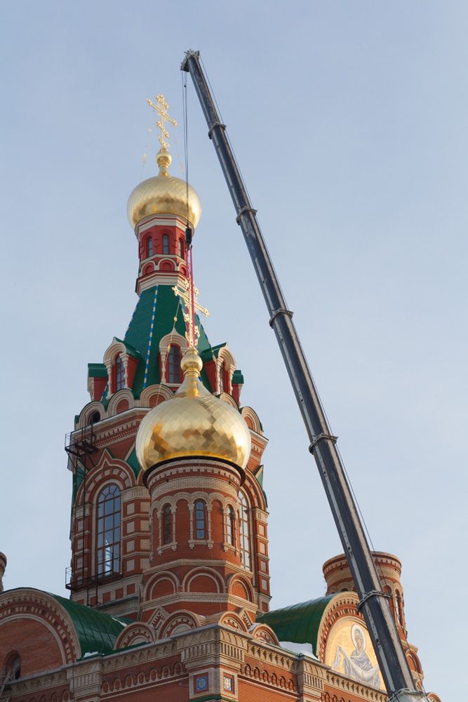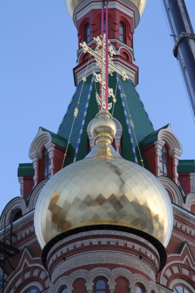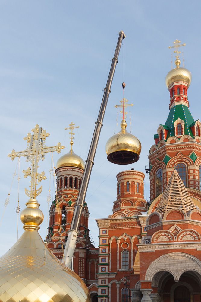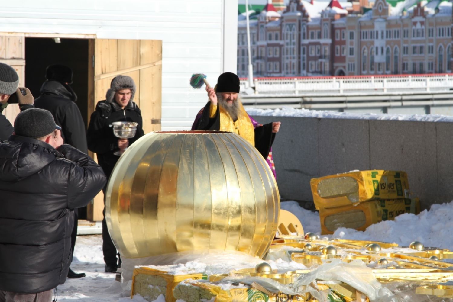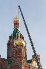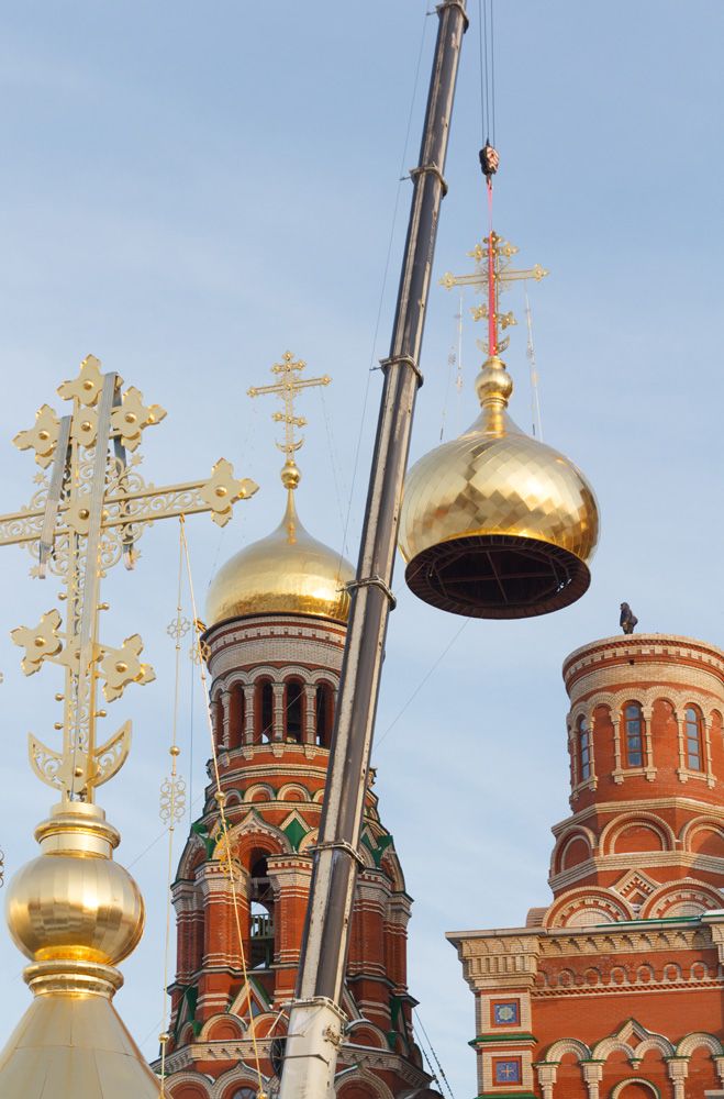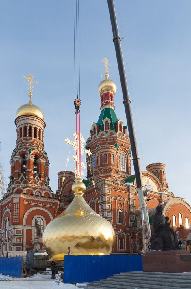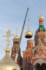 Во второй половине дня был поднят и водружен первый из четырех куполов с крестами, вес каждого из которых около 8-ми тонн. Остальные три купола поставят в течении недели. Позолоту на купола наносили мастера, прибывшие из Санкт-Петербурга и Москвы. Подъем производится специальной техникой, которая была доставлена в Йошкар-Олу из Нижегородской области.