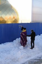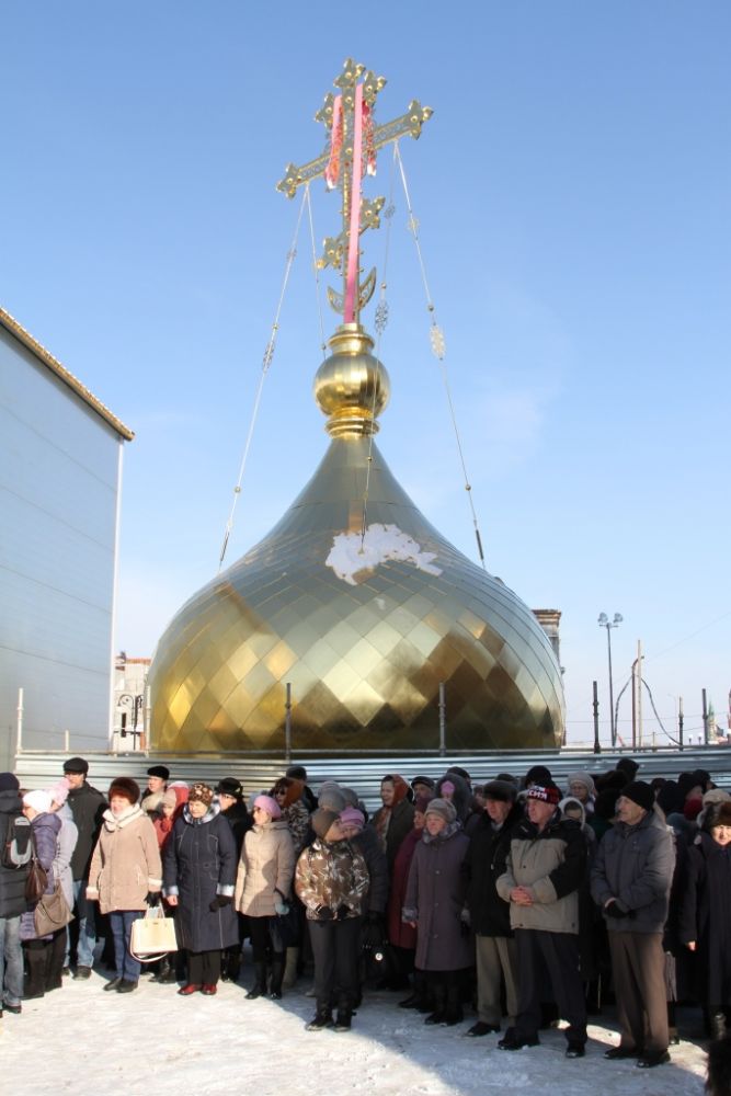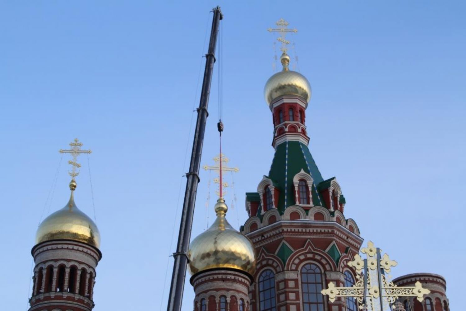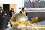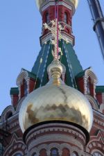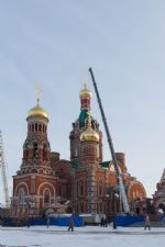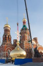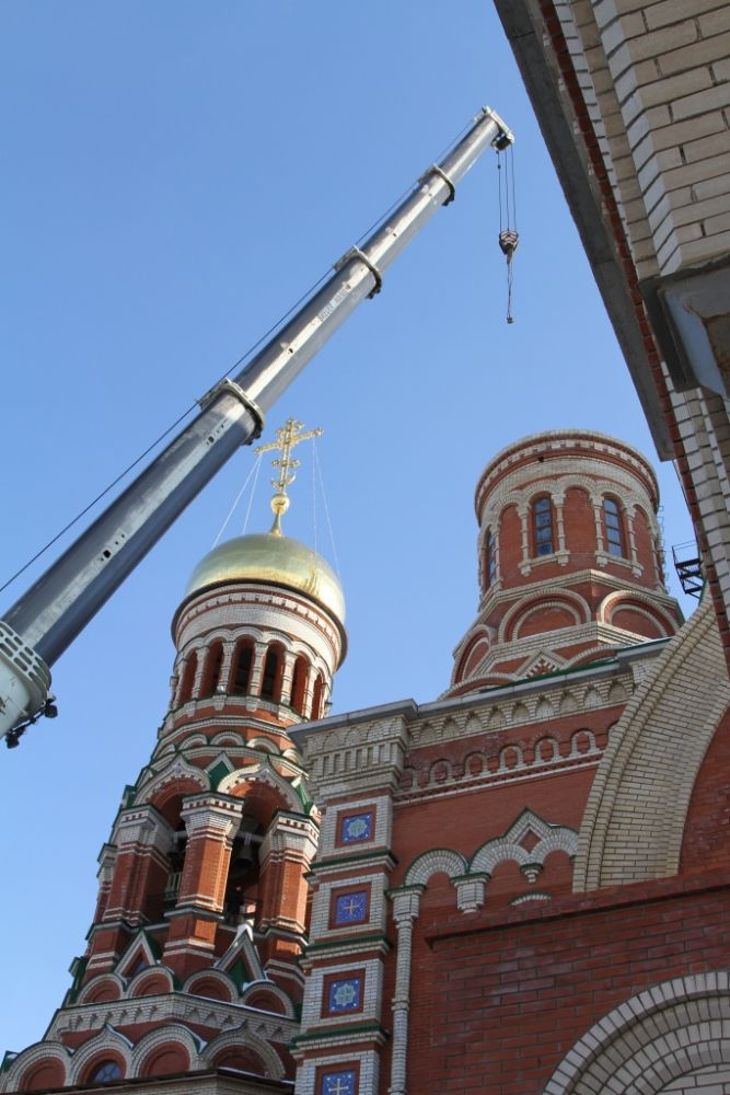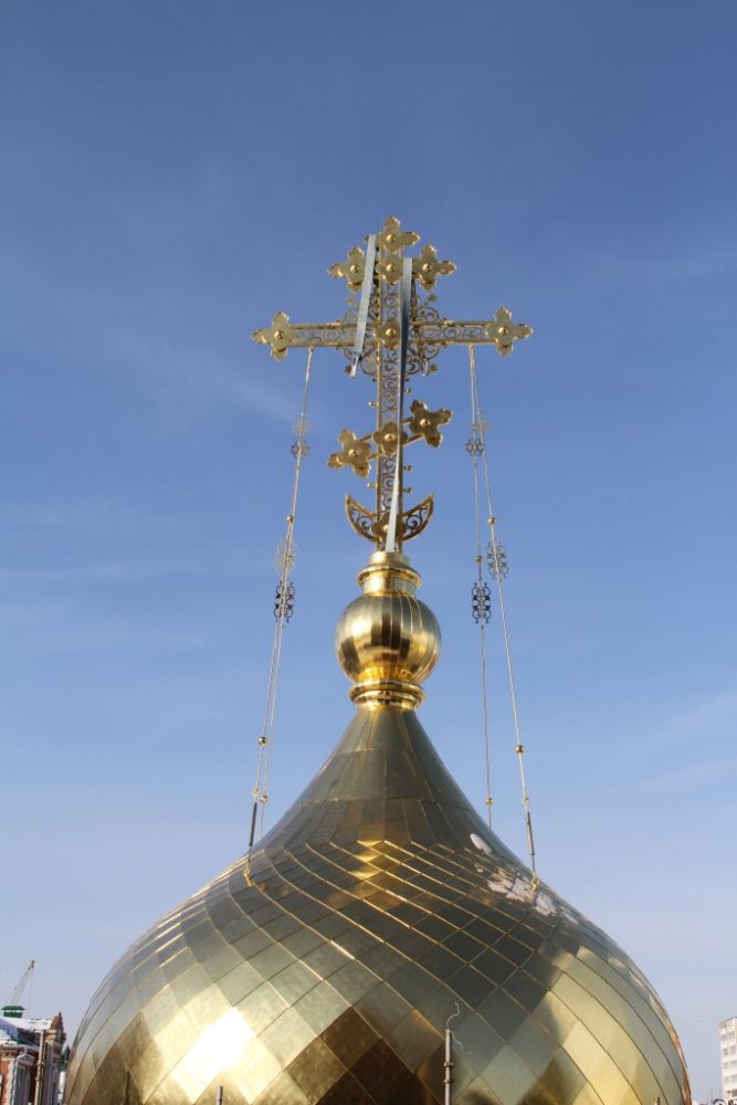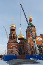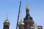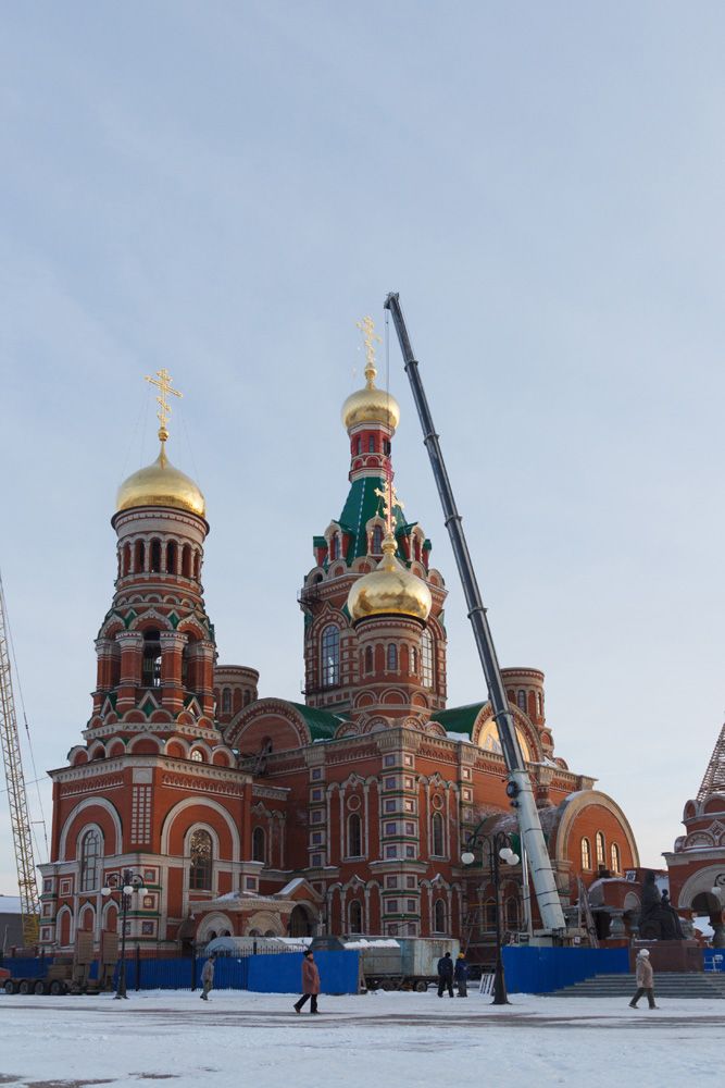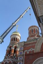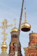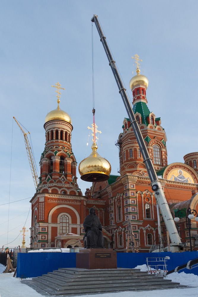 Во второй половине дня был поднят и водружен первый из четырех куполов с крестами, вес каждого из которых около 8-ми тонн. Остальные три купола поставят в течении недели. Позолоту на купола наносили мастера, прибывшие из Санкт-Петербурга и Москвы. Подъем производится специальной техникой, которая была доставлена в Йошкар-Олу из Нижегородской области.