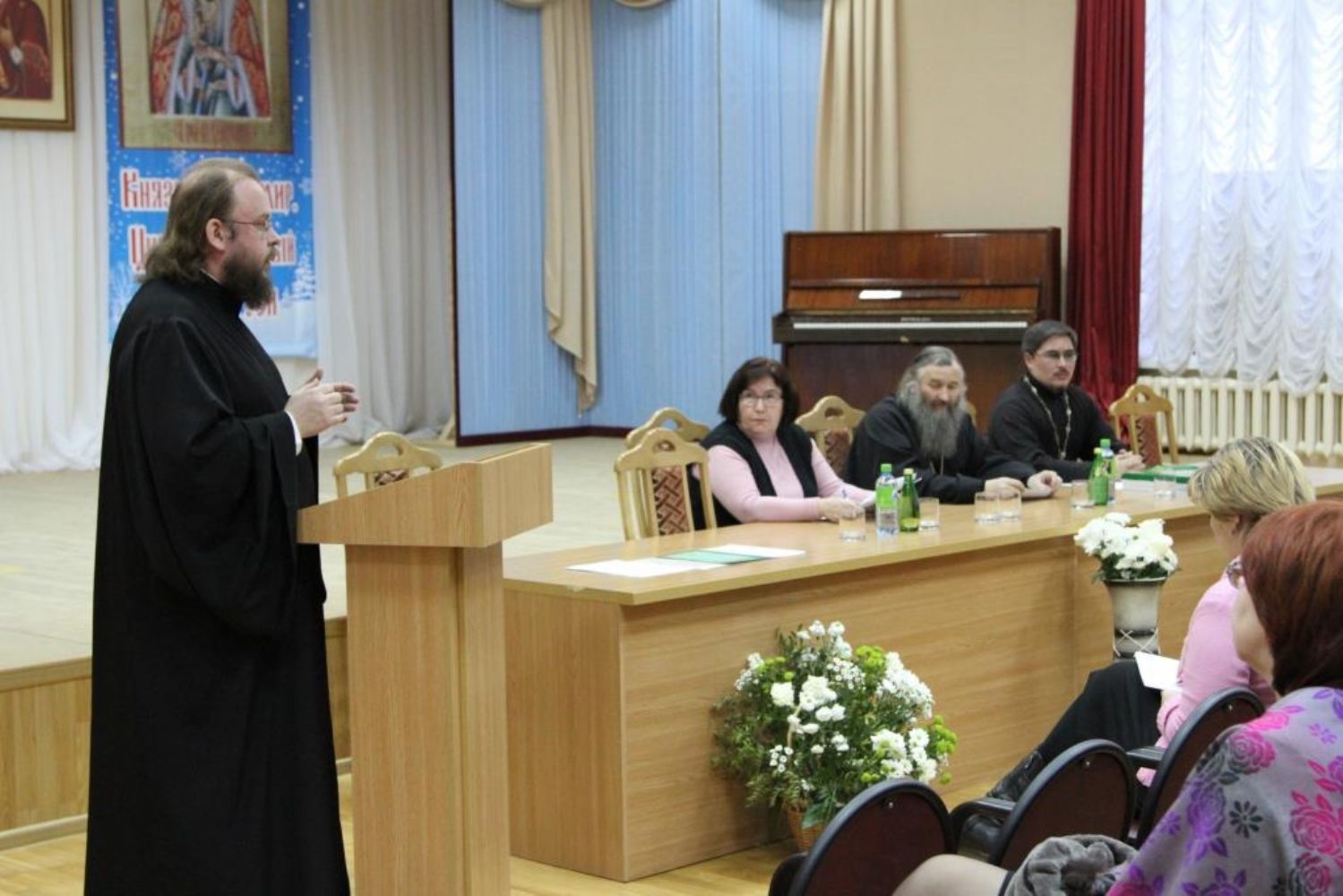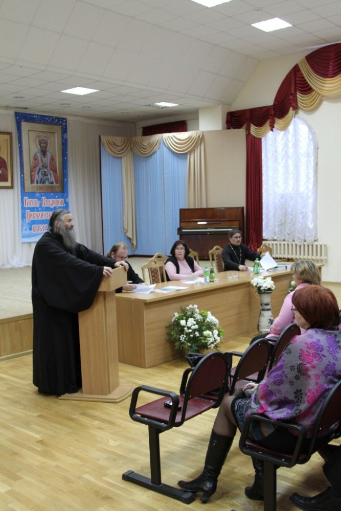 В 14.00 в актовом зале Православного центра открылось заседание круглого стола. Участие в нем приняли представители городского отдела образования, руководители общеобразовательных учреждений, представители благочиний, священнослужители, закрепленные за общеобразовательными школами. Провел заседание директор православной гимназии им. Сергия Радонежского протоиерей Евгений Сурков.