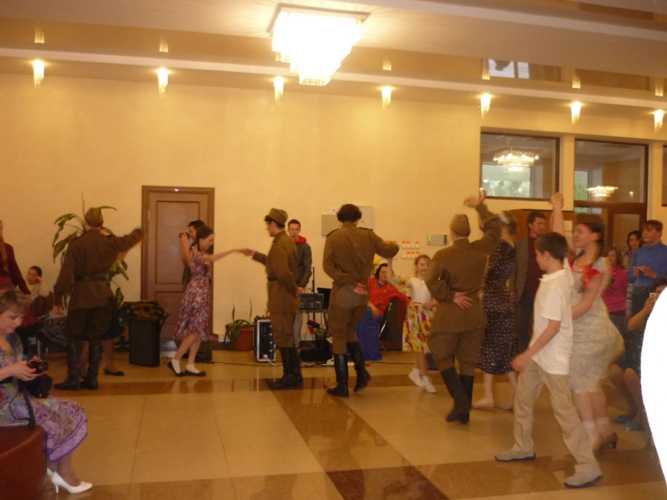 На следующий день мы прошли под проливным дождем крестным ходом от обители преподобного Саввы Сторожевского в Звенигороде по последнему рубежу обороны Москвы. Затем был показан музыкально-пластический спектакль «Победа» в постановке студии «Алый парус» Детского православного движения «Вестники». Завершением мероприятия стал танцевальный вечер в стиле 40-х годов, на котором дети с удовольствием исполняли па де грас, вальс, польку и другие танцы, которые танцевали их прабабушки и прадедушки.