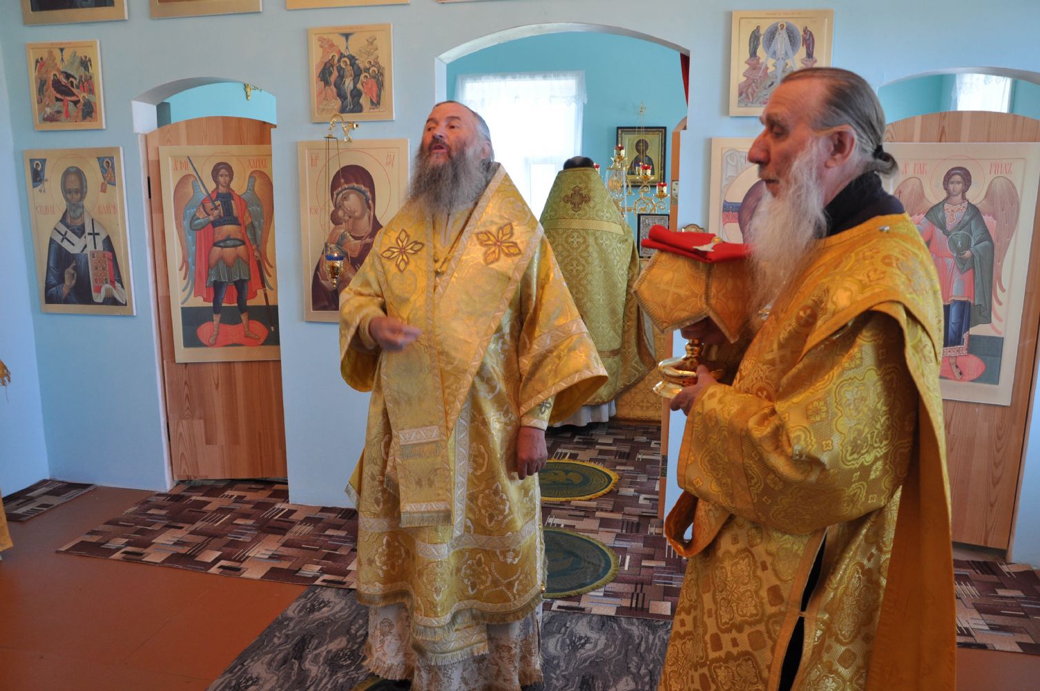 Владыке сослужили: благочинный Пригородного церковного округа, настоятель храма в честь иконы Божией Матери «Казанская» с. Нурма священник Александр Коваль, настоятель храма в честь «Всех святых в земле Российской просиявших» п. Советский протоиерей Николай Ярошевич, настоятель храма святых бессребреников Космы и Дамиана с. Орша протоиерей Сергий Мошкин, настоятель храма в честь иконы Божией Матери «Державная» п. Медведево протоиерей Алексий Михайлов, настоятель храма в честь Сретения Господня с. Азаново протоиерей Николай Егошин, настоятель храма в честь иконы Божией Матери «Владимирская» с. Кузнецово священник Василий Яшмолкин и настоятель Свято-Троицкого храма с. Вятское священник Вячеслав Мамаев.