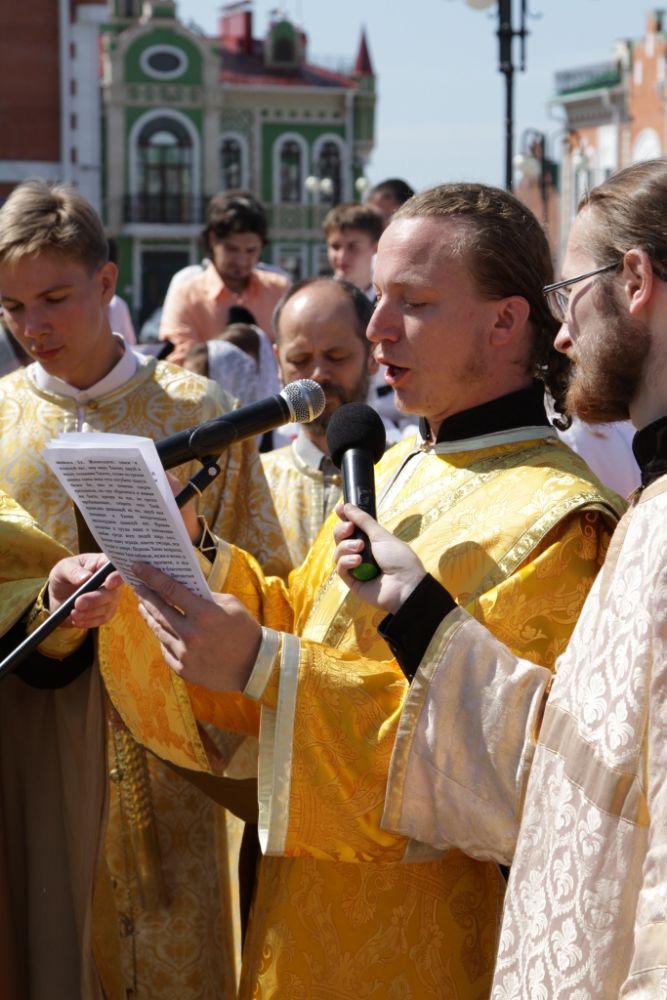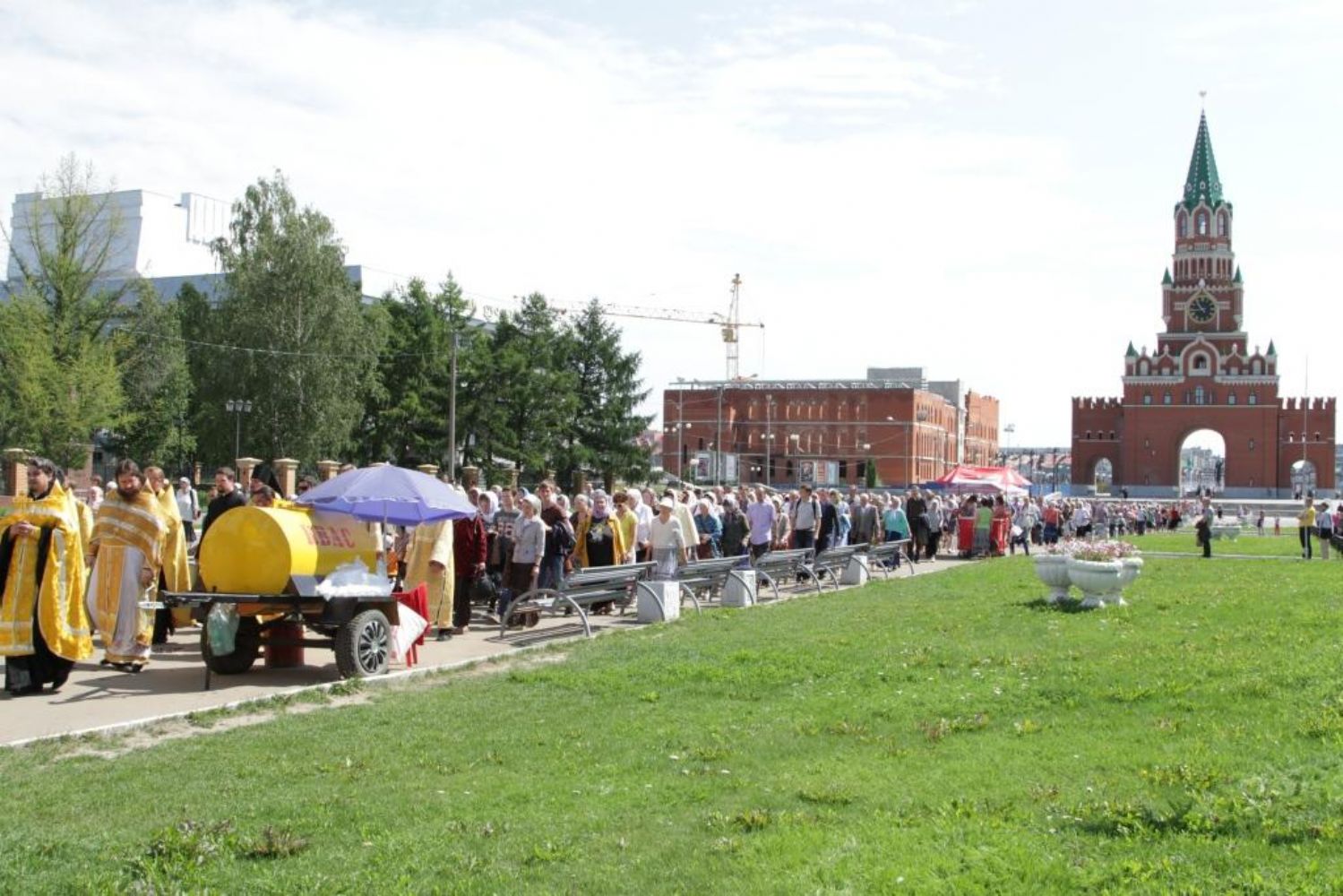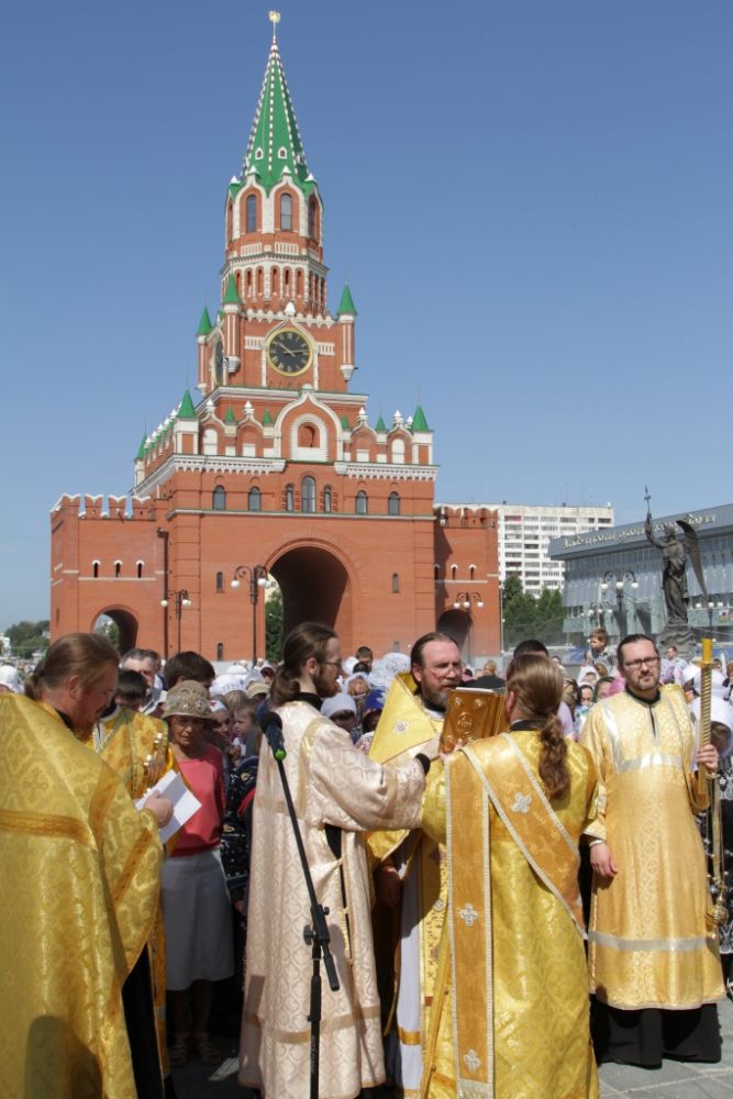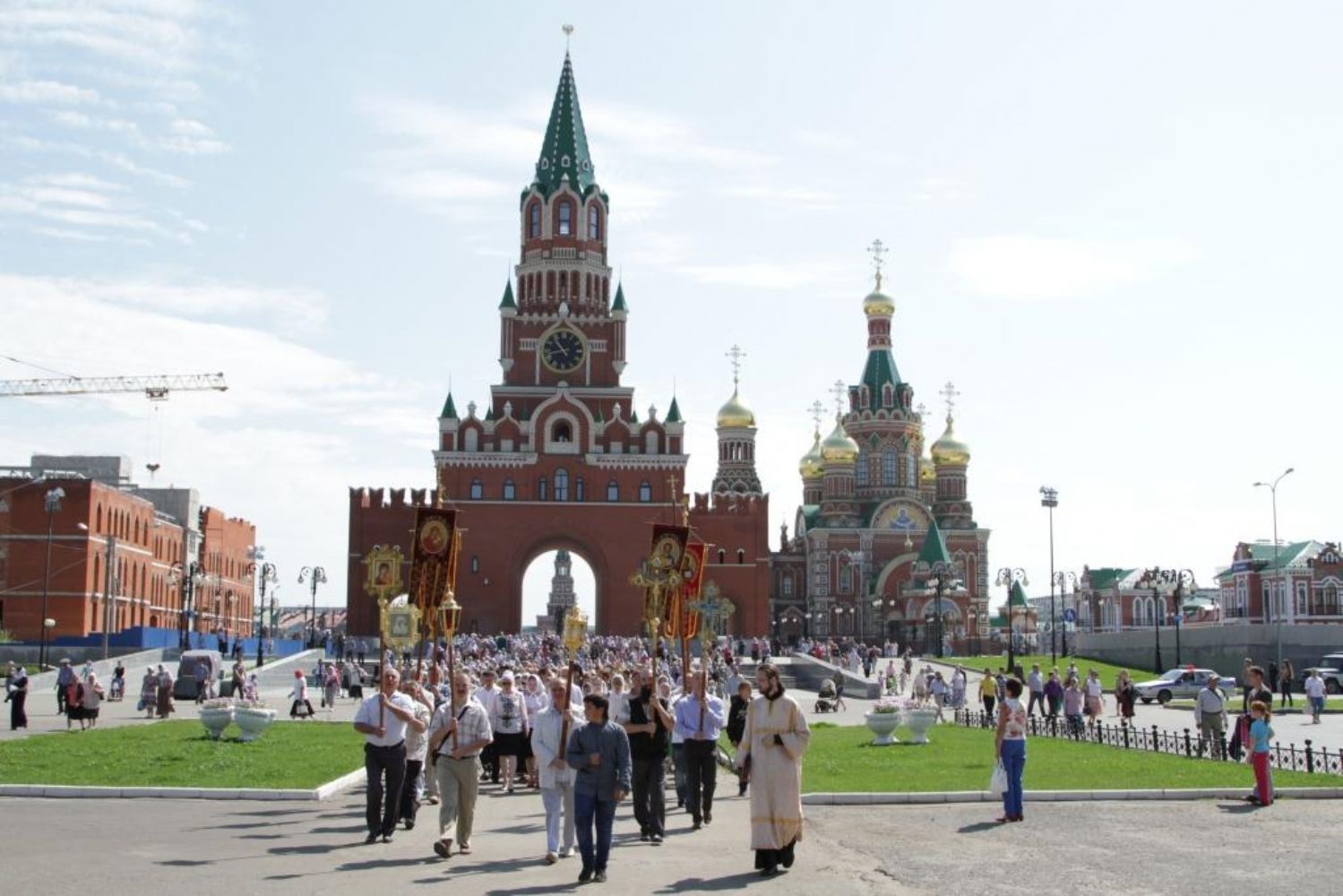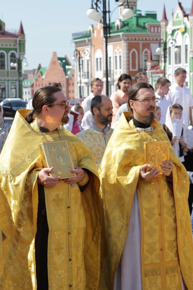 Молитвенное шествие одновременно началось в трех храмах города: в Вознесенском кафедральном соборе, Воскресенском соборе и храме в честь Успения Пресвятой Богородицы. Крестный ход прошел до площади Девы Марии к строящемуся Благовещенскому собору, где было совершено молебное пение в День Крещения Руси. Молебен по благословению архиепископа Йошкар-Олинского и Марийского Иоанна возглавил секретарь Епархиального управления иеромонах Серафим (Пасанаев). Ему сослужили настоятель Воскресенского собора, протоиерей Сергий Поглазов, настоятель храма Державной иконы Божией Матери протоиерей Алексий Михайлов, клирики Йошкар-Олинской и Марийской епархии. На площади перед собором собралось около 1000 верующих, пришедших почтить память равноапостольного князя.