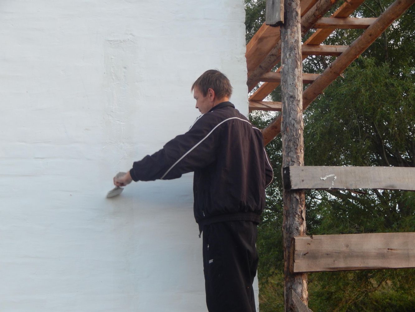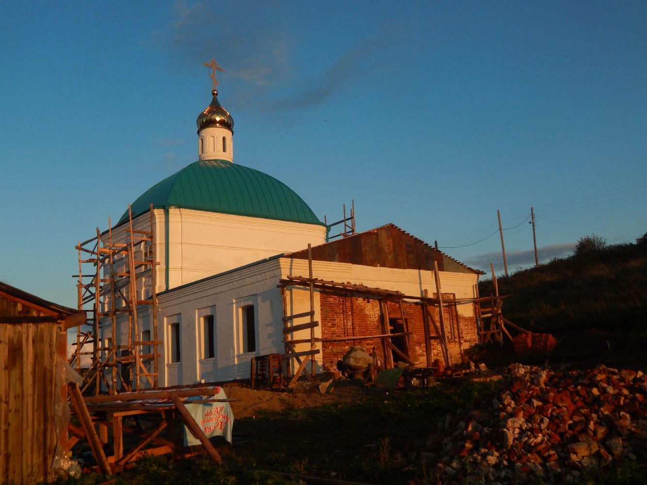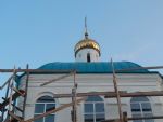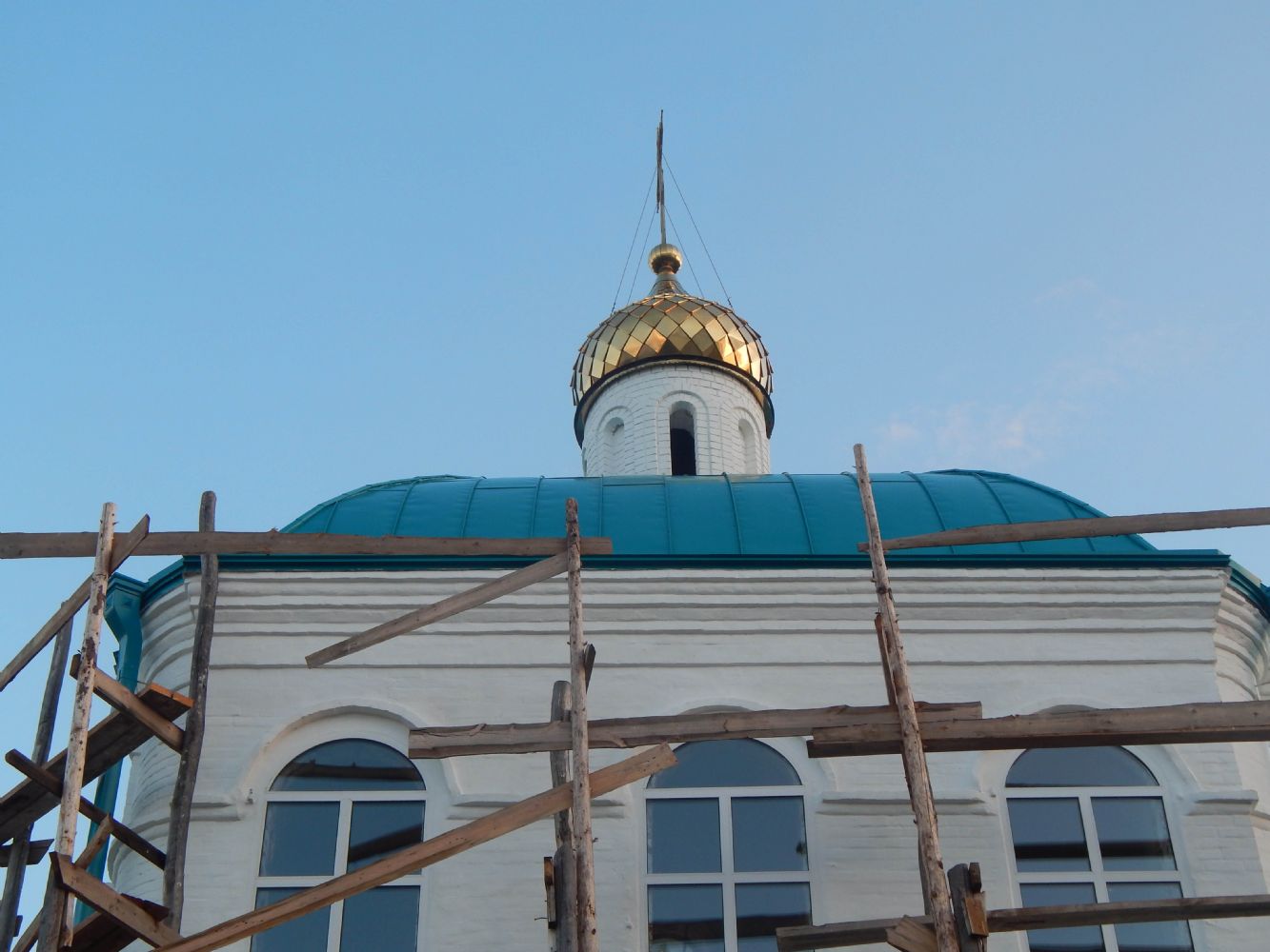 Много работы сделано как внутри храма, так и снаружи. Перекрыта крыша, возведен купол и крест, заштукатурены стены алтаря, на все окна установлены стеклопакеты. Пол выстелен деревом. Продолжаются отделочные работы с внешней стороны храма. Не так давно подготовлено место под заливку фундамента для колокольни.