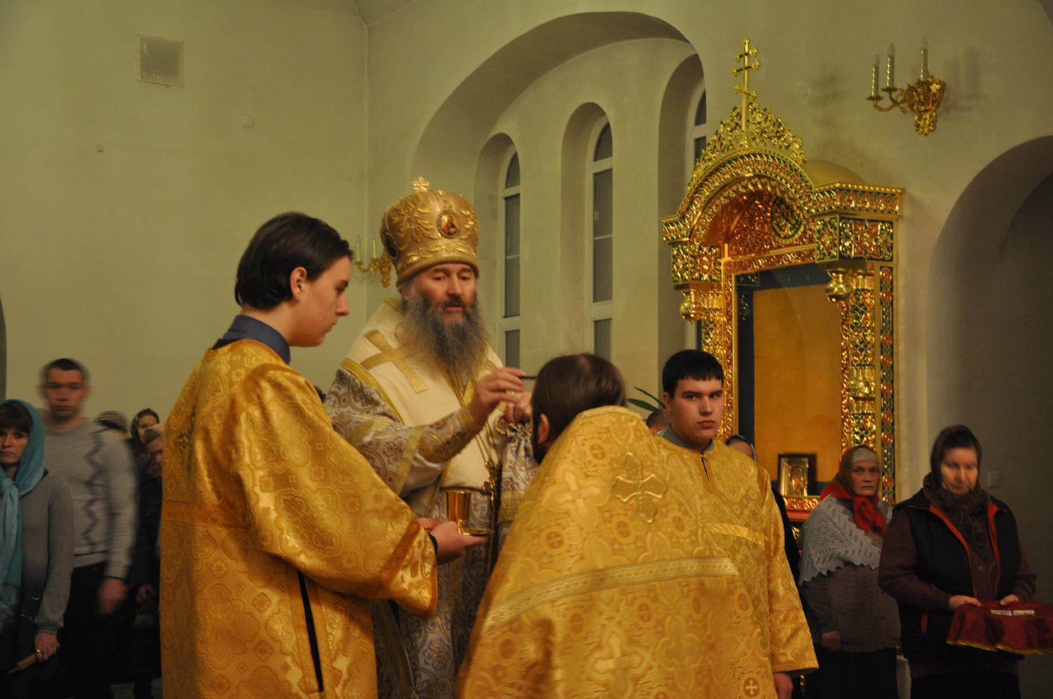 В небольшом, но уютном храме собрались верующие, чтобы вместе со своим Архипастырем помолиться за Божественной литургией и причаститься Святых Христовых Тайн. Сослужили Владыке секретарь епархии иеромонах Серафим (Пасанаев), благочинный Лугово-Марийского церковного округа протоиерей Алексий Никитин и настоятель храма иерей Михаил Репин. В честь святого благоверного князя Александра Невского, память которого совершалась в этот день, был отслужен праздничный молебен.