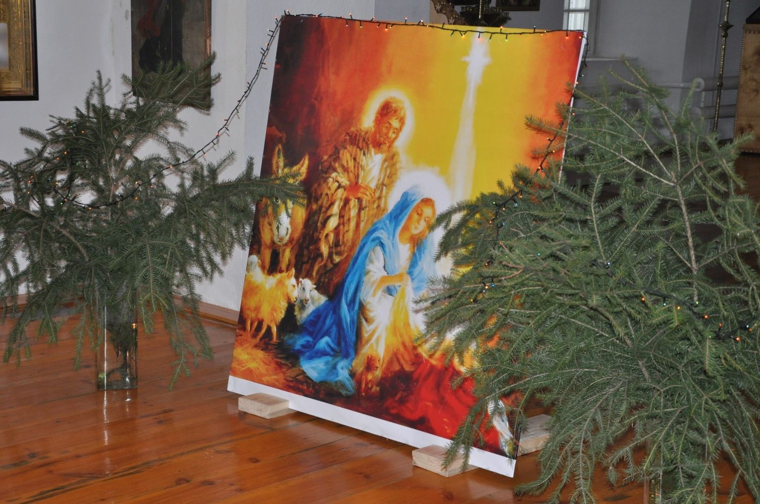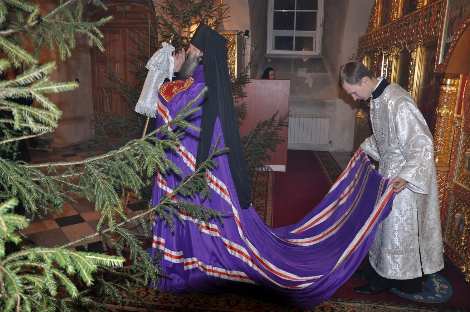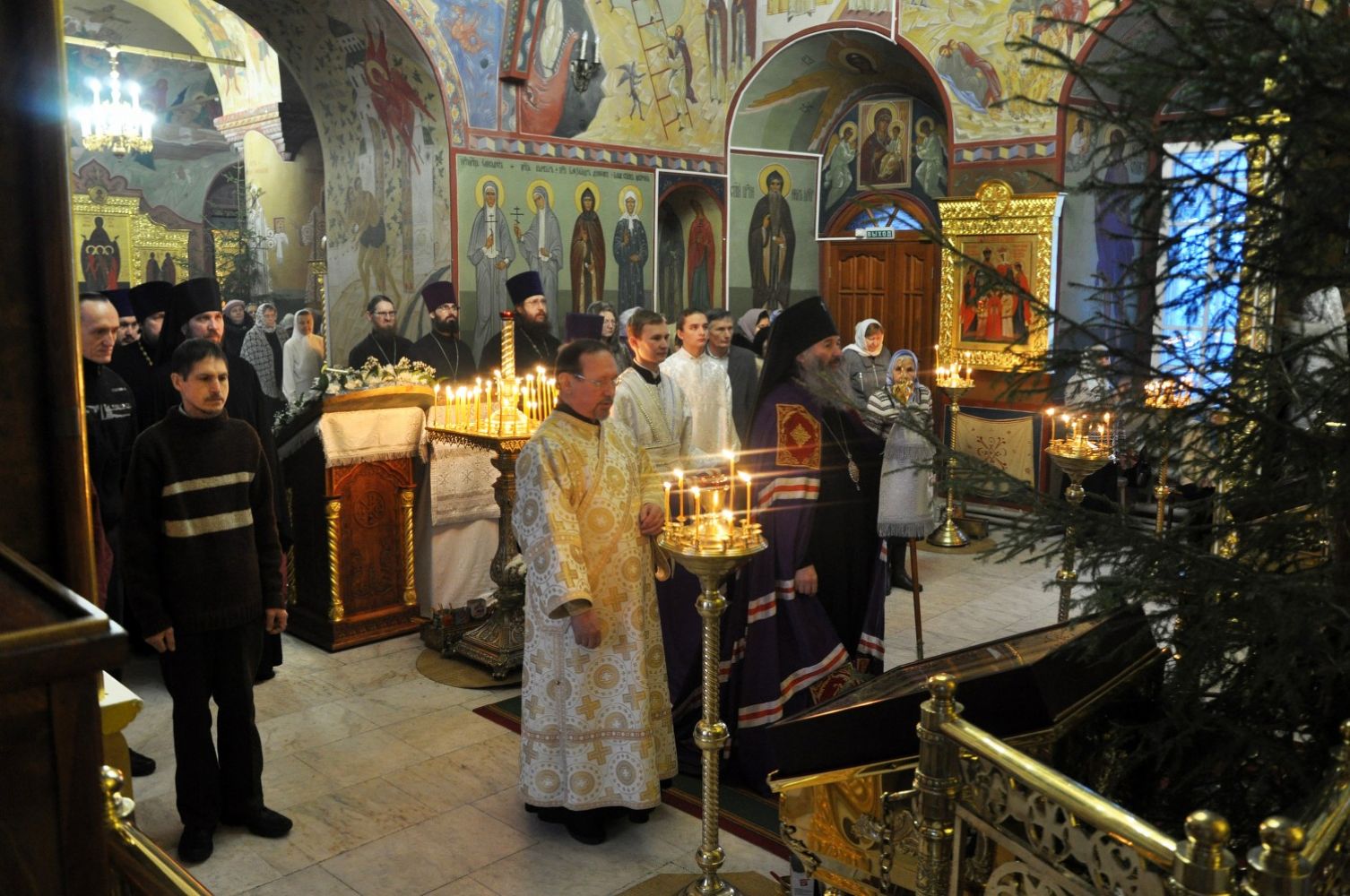 По окончании Литургии было совершено славление празднику Рождества Христова. Затем Владыка всех поздравил с праздником и обратился к молящимся с проповедью: «Сегодняшний день посвящен Той, Которая явилась даром от всего человечества Богу. Если небо принесло звезду, Ангелы от небесного чина восхвалили Творца всяческих Бога, земля принесла вертеп, то мы – земнороднии принесли Пречистую Богоматерь. Понадобилось почти пять тысячелетий, что бы нашлась Та, Которая в смирении своем могла вместить в себя невместимого Бога».