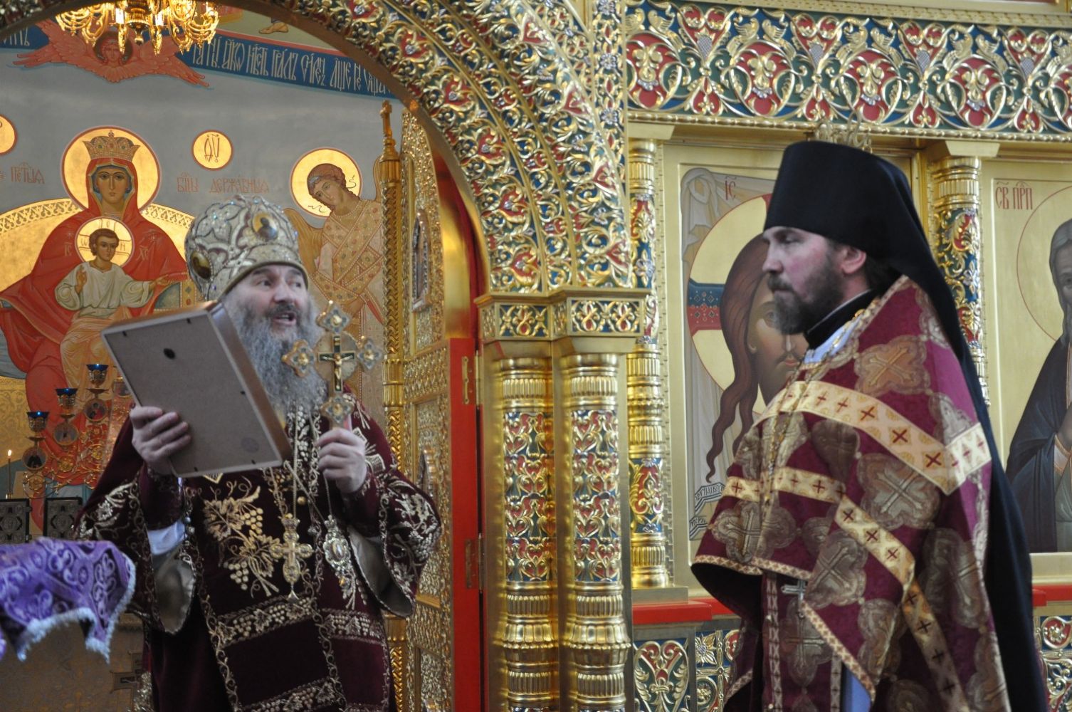 По окончании Литургии Владыка поздравил секретаря Епархиального управления иеромонаха Серафима (Пасанаева) с днем тезоименитства и преподнес в дар икону Святителя Николая Чудотворца и Богородичную просфору.