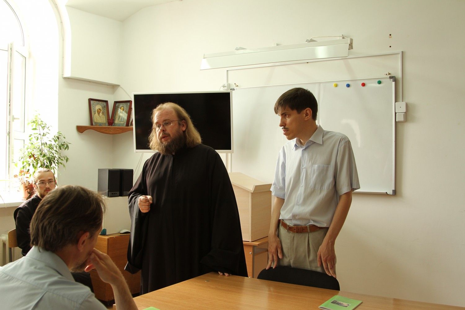 После обеда с презентацией Методического пособия и Рабочей тетради по модулю ОПК выступил руководитель грантового проекта, директор МОУ «Гимназия имени Сергия Радонежского» протоиерей Евгений Сурков, который представил авторов – учителя гимназии Тищенко А.В. и чтеца Григория Михеева. В заключение своей презентации авторы подарили учителям по комплекту Методического пособия и Рабочей тетради и ответили на вопросы слушателей семинара.