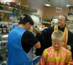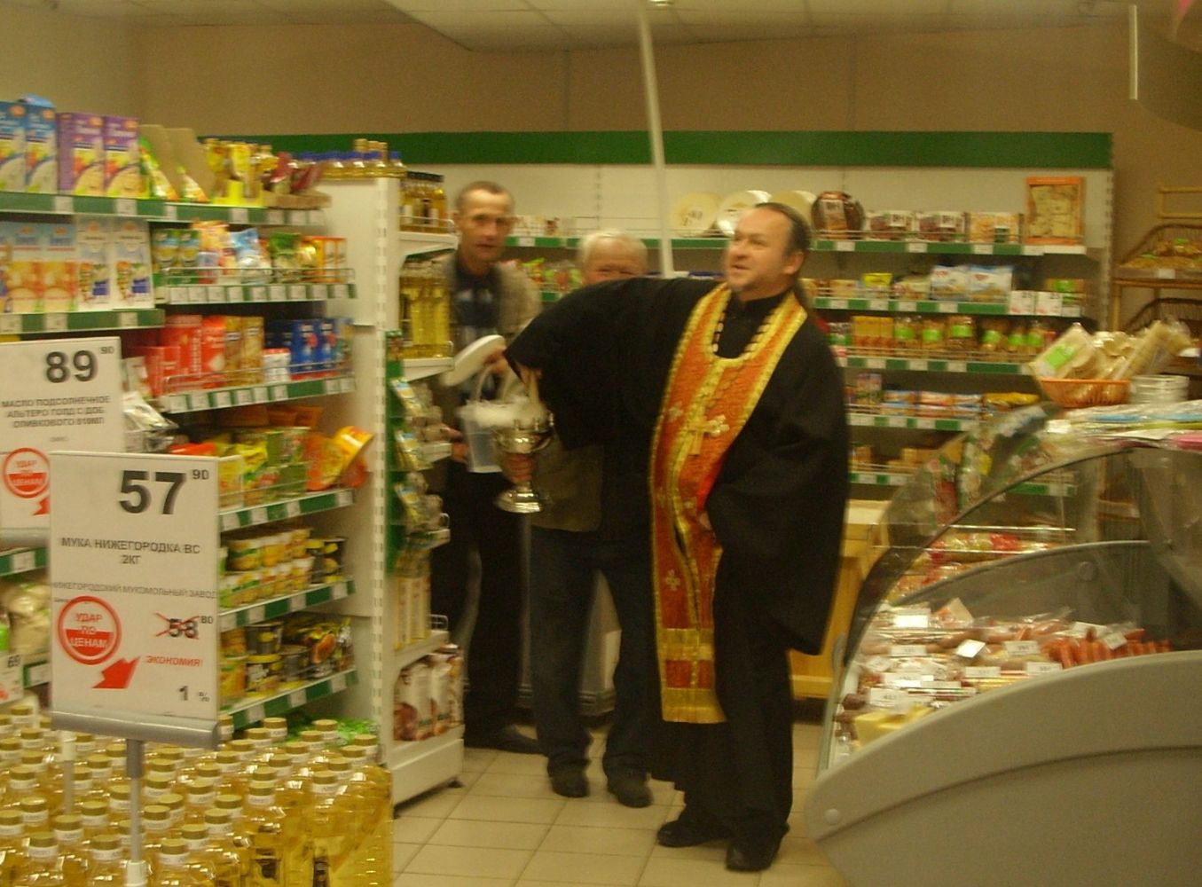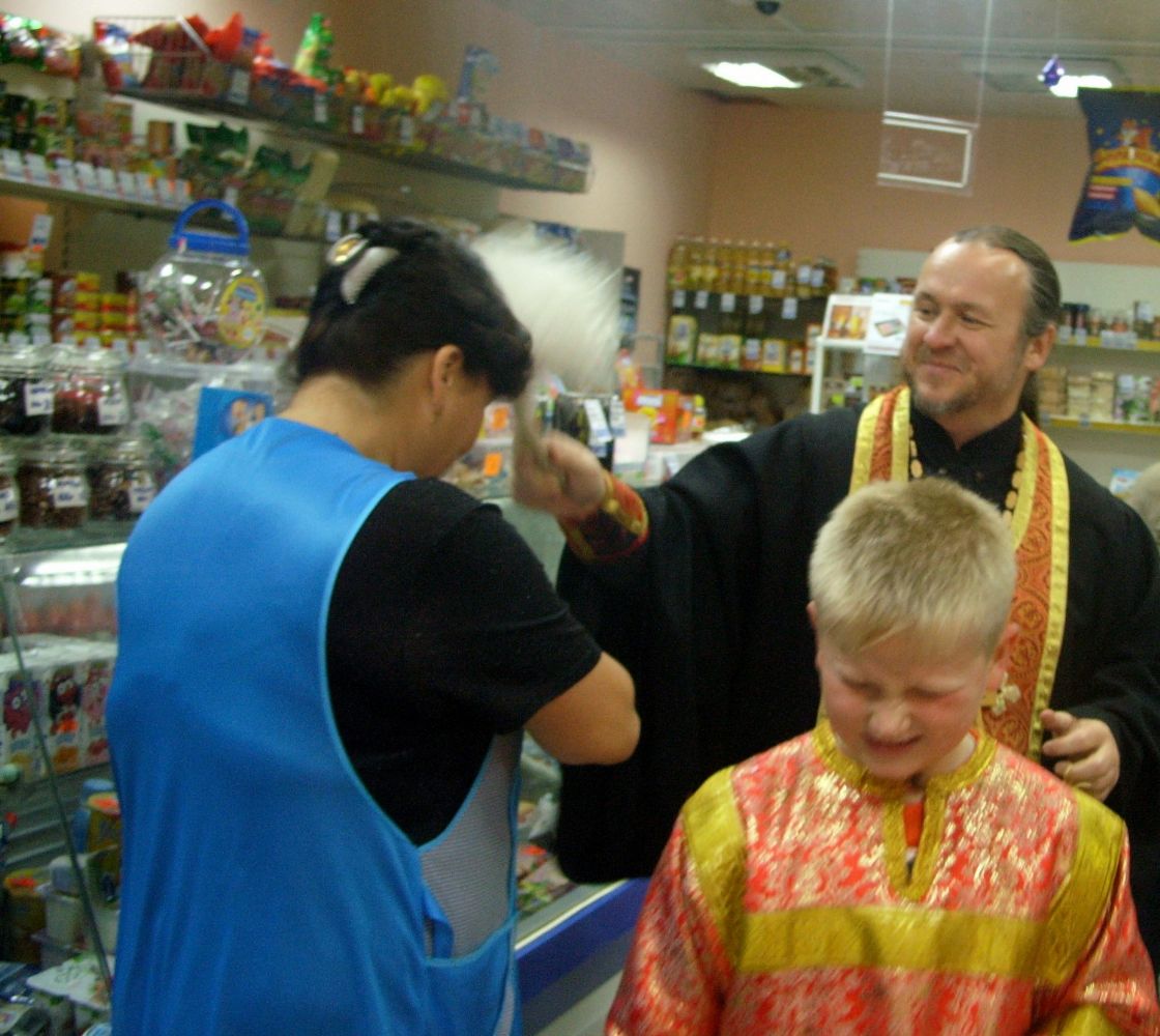 Затем прихожане и гости храма прошли крестным ходом с иконой «Глава Иоанна Предтечи на блюде» по улицам поселка, делая остановки у торговых точек, где продается спиртное. Отец Димитрий окроплял магазины снаружи и изнутри святой водой с благословением на избавление оршанцев от греховной пагубы пьянства.