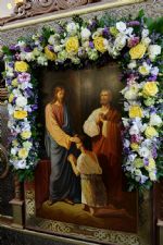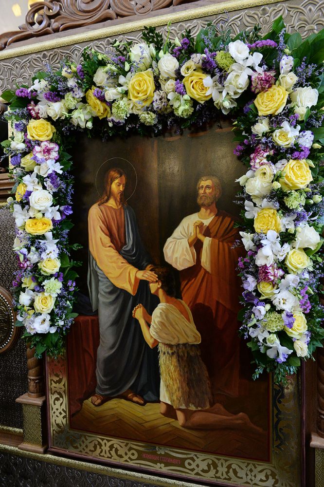 По окончании богослужения настоятель Патриаршего подворья в Новокосино протоиерей Михаил Звонов приветствовал Святейшего Патриарха и преподнес Его Святейшеству икону Исцеление Господом глухого, написанную глухими иконописцами.