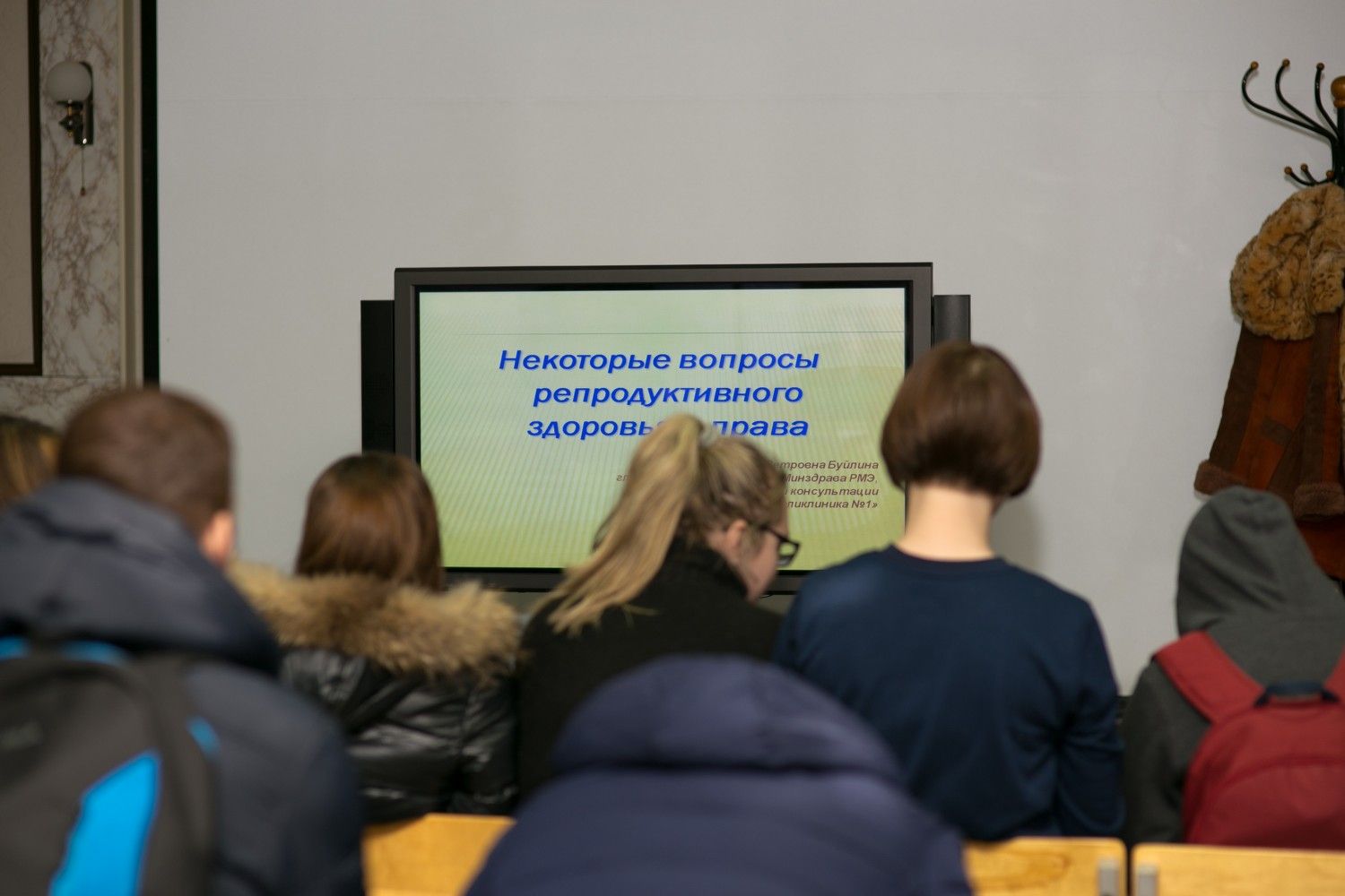 В аудитории собралось около 30 студентов, юношей и девушек. Перед ними выступила главный акушер-гинеколог РМЭ Ольга Петровна Буйлина. Она рассказала о влиянии вредных привычек на репродуктивное здоровье и о последствиях аборта с точки зрения медицины. В конце выступления был показан короткий ролик, раскрывающий суть аборта.