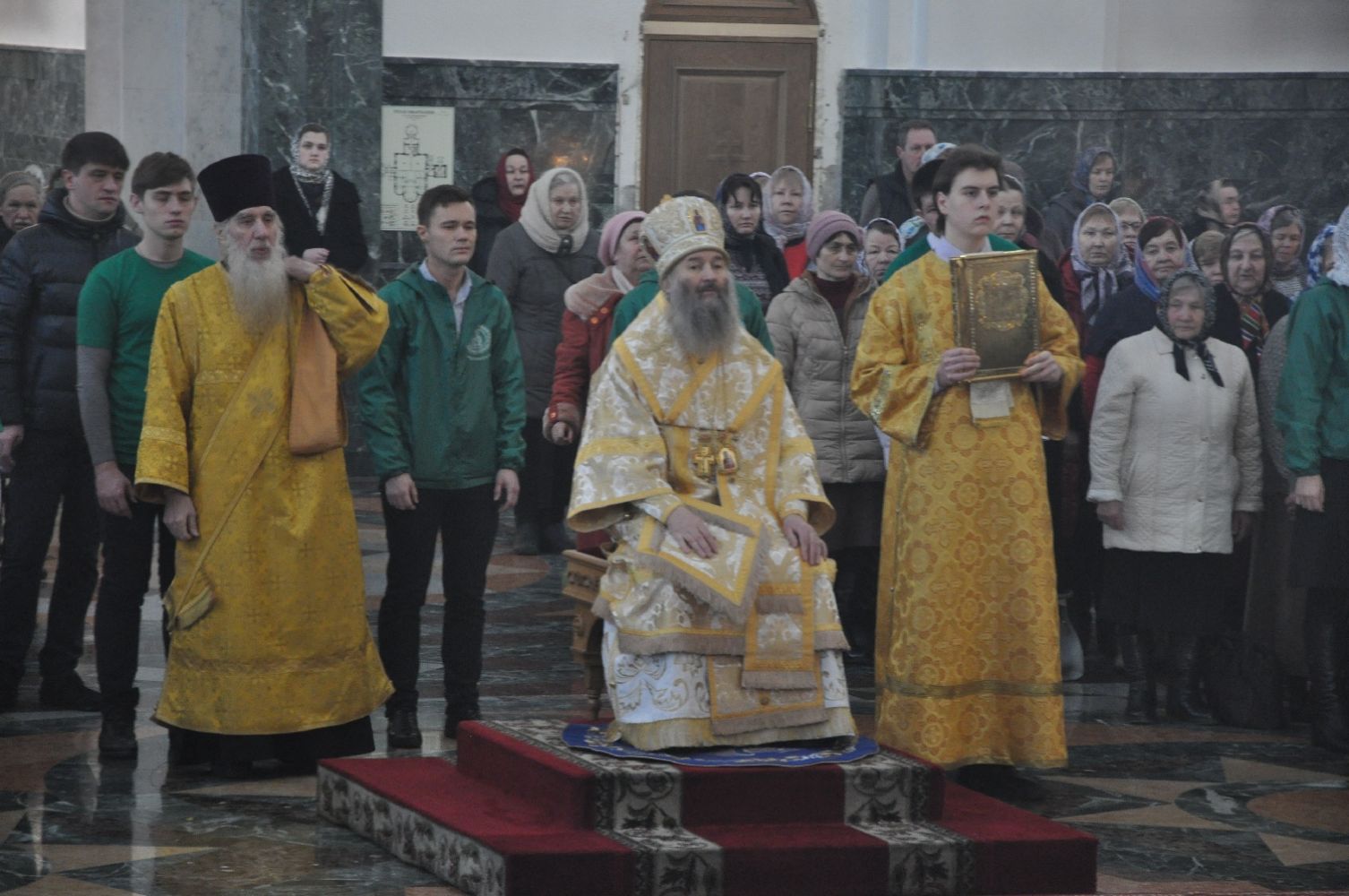 Владыке сослужили: секретарь Епархиального управления иеромонах Серафим (Пасанаев) и клирики храма: протоиерей Павел Матвеев, иерей Димитрий Иванов, иерей Павел Дурандин и иерей Григорий Михалев. Богослужебные песнопения исполнил хор храма под управлением регента Надежды Торощиной.
