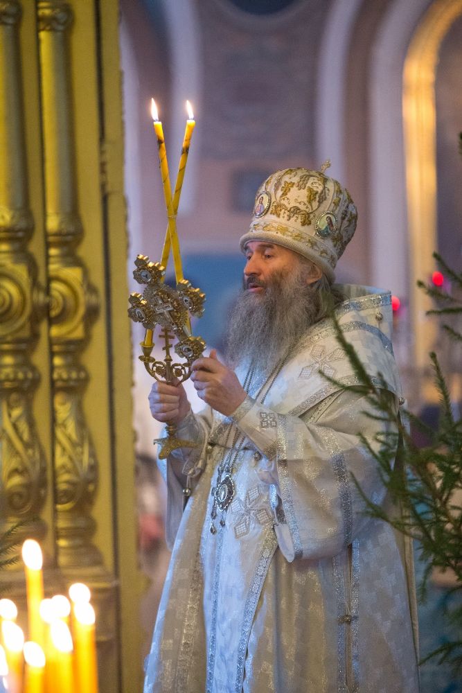 Владыка, обращаясь к пастве, поздравил всех с навечерием Великого праздника Богоявления Господня: «В навечерие Богоявления совершают великое водоосвящение, и благодать Всесвятого Духа по молитвам нас недостойных снизошла на воду и освятила ее. Она стала Великой святыней, Великой агиасмой, которая даруется каждому человеку чтобы он употреблял ее, чтобы мы окропляли себя и жилище свое, и храмы на прогнание коварного врага, на прогнание злых духов, чтобы человек вновь и вновь ощутил ту благодать, которую Господь даровал водной стихии. Когда Сам Господь вошел в реку Иордан, река возмутилась, Иордан вспять обратился, «Владыку зря Крещаемого», и глас Отца с небес «Сей есть Сын Мой Возлюбленный, в Нем же Мое благоволение» и Дух Святой Снизошел — Святая Троица явилась нам, просвещая всякого человека, живущего в мире. И пусть, возлюбленные братья и сестры, каждый сегодня, с благоговением и трепетом вкушает Великую агиасму, освящая все свое естество. Всех вас поздравляю с навечерием Богоявления Господня. С праздником!»