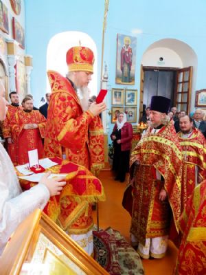 На малом входе, по благословению Святейшего Патриарха Кирилла, его Преосвященство наградил правом ношения наперсного креста с украшением настоятеля Богоявленского храма протоиерея Леонтия Очетова.