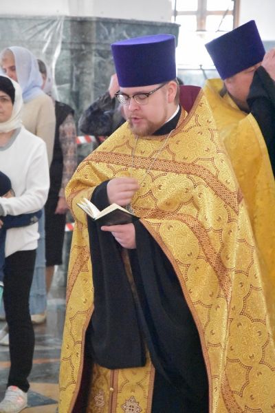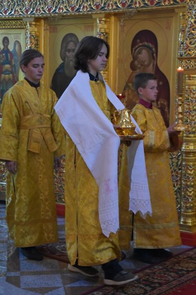 Владыке сослужили: ключарь собора протоиерей Сергий Поглазов, клирики собора иерей Никифор Захаров, иерей Артемий Промович, иерей Евгений Самойлов, диакон Андрей Дружинин, диакон Игорь Коваль и клирик храма Рождества Пресвятой Богородицы села Семеновка протодиакон Михаил Козловский.