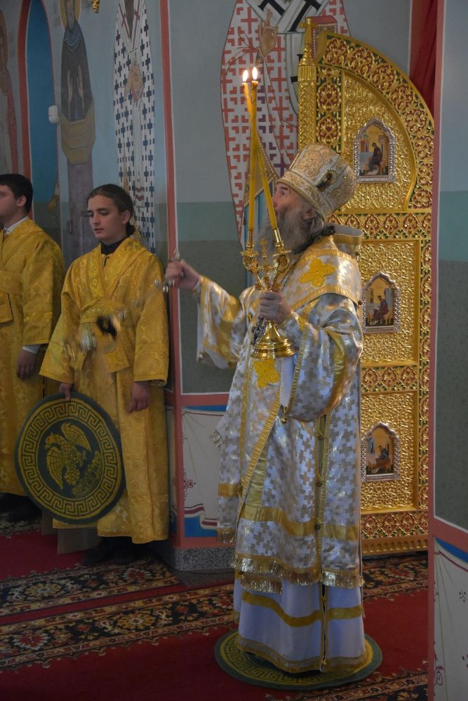 Владыке сослужили: клирик храма иерей Константин Домрачев и клирик храма Рождества Пресвятой Богородицы села Семеновка протодиакон Михаил Козловский.