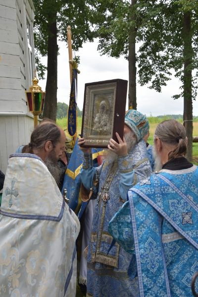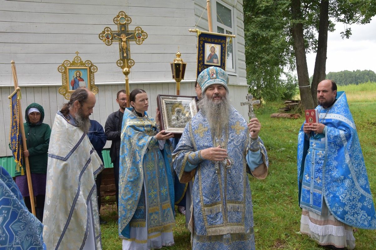 Богослужение началось торжественной встречей архиерея. По окончании Божественной литургии прошел крестный ход вокруг восстанавливаемого деревянного храма Сретения Господня с иконой Пресвятой Богородицы «Смоленская» Седмиезерная. После чтения Евангелия и кропления святой водой Владыка благословил всех молящихся святым образом Царицы Небесной.