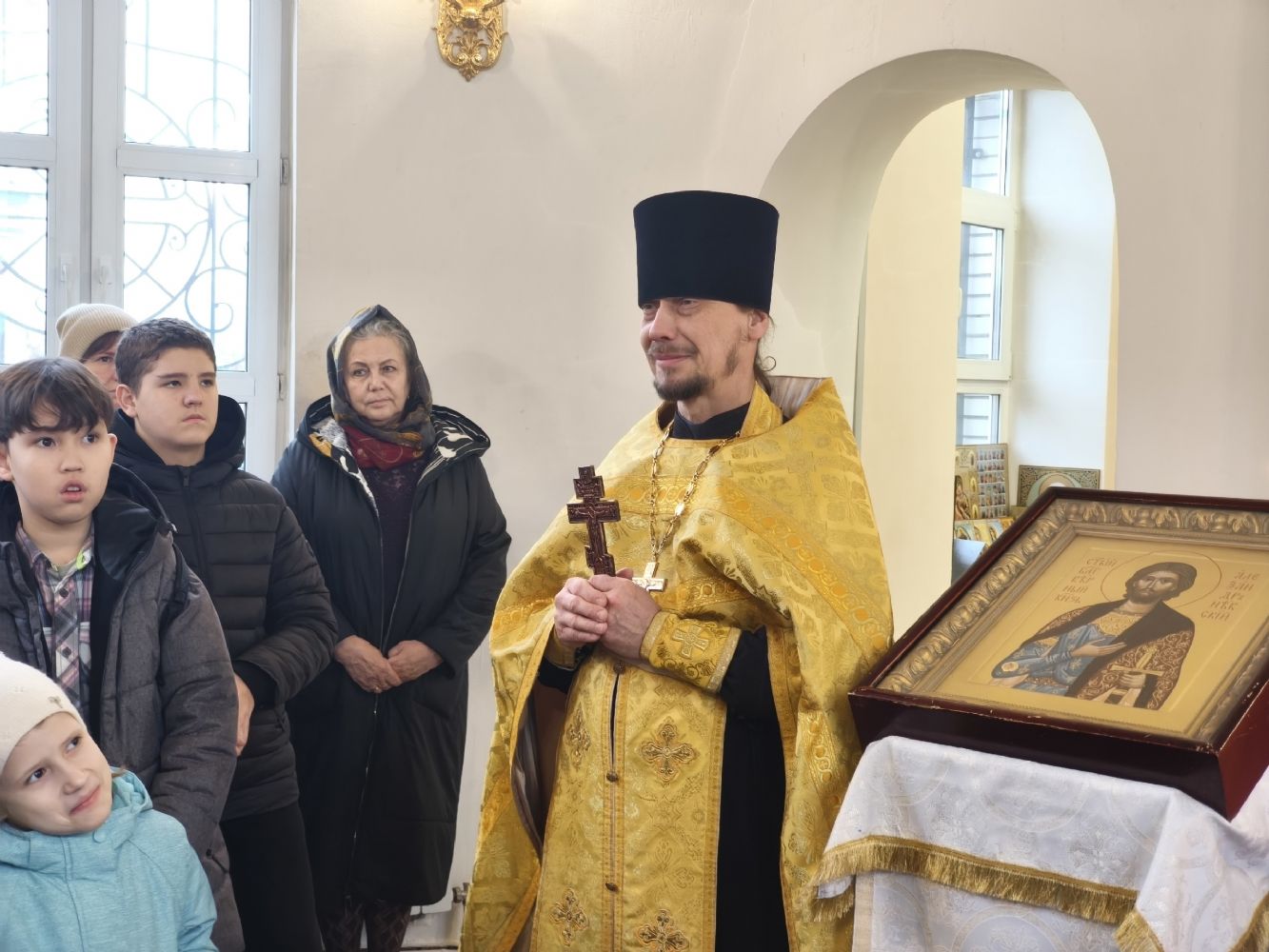 Встреча началась с молебна святому князю Александру Невскому в часовне, освященной в честь него. Молебен совершил настоятель Воскресенского собора иерей Андрей Кочаков. Далее отец Андрей провел для ребят экскурсию по храму – рассказал об истории собора, о главных святынях и чтимых иконах.