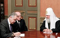 святейший патриарх рассказал гостю о межрелигиозном диалоге в российской федерации, о работе межрелигиозного совета россии; он также коснулся вопросов преподавания в российских школах религиозной культуры и пастырского окормления военнослужащих.