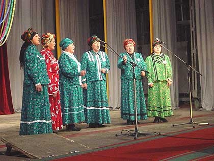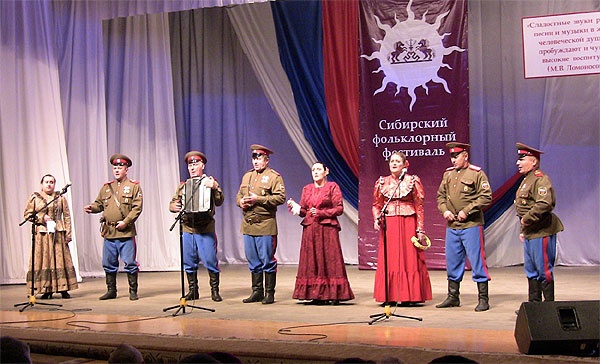 иртышские чалдоны - ансамбль линейных сибирских казаков «воля» («союз казаков степного края», г. павлодар, руководитель – м.борина), семиреченские чалдоны – фольклорный ансамбль "зори семиречья» (г. алма-ата, рук.- заслуженный деятель культуры т.трубачёва), ансамбль семиреченских казачек «товарки» (семипалатинская область, глубоковский район, с. предгорное, рук.- н.а.ершова), обские чалдоны – ансамбль фольклорной песни «руны» (тюменская область, г. нижневартовск, дворец искусств, рук.- а.л.култышева), фольклорный студенческий коллектив «русская сказка» (кемеровская область, г. новокузнецк, кузбасская государственная педагогическая академия, рук.- в.в.трубицына), фольклорное объединение «горница», искитимский район, п. линево, «центр дополнительного образования детей «спутник», рук.- т.в.мурзинцева), коллектив народной песни «здравица» (алтайский край, г. белокуриха, рук.- о.пушкарёва и т.севрюгина), ансамбль «былина» (алтайский край, г. новоалтайск, рук.- а.гойда), фольклорный ансамбль «ярманка» (республика алтай, с. турочак, рук. вялкова), коллективы сибирских казаков: дуэт «семья михайловых» (кемеровская область), ансамбль казачьей песни «вольница» (кемеровская область, г. междуреченск, рук.- с. кононов), народный казачий ансамбль песни «тальянка» (новосибирская область, ордынский район, с. вагайцево, рук.- с.янушевич и с.ивлев), енисейские чалдоны – образцовый детский фольклорный ансамбль "завалинка" (красноярский край, г. железногорск, рук.- е.попкова), фольклорно-этнографический ансамбль «октай» (тува, г. кызыл, рук.- н.пономарева), народный коллектив фольклорный ансамбль енисейских казаков «криницы» (красноярский край, г.зелоногорск, рук.- г.казарезова, худ. рук.- т.ткачева), забайкальские чалдоны – коллективы «семейских» (забайкальских старообрядцев): народный семейский ансамбль «родник» (бурятия, с. хасурта, рук.- в.ф.иванов), этнографическая фольклорная группа с. архангельского (читинская область, с. архангельское, рук.- а.т.титова), народный художественный коллектив забайкальских казаков «ивушки» (бурятия, прибайкальский район, с. ильинка, рук.- т.мунгалова). особенно тепло было принято зрителями выступление самых дальних гостей - кубанских казачат из фольклорного коллектива «школа-интернат народного искусства для одаренных детей им. в.г. захарченко» (рук.- е.лемарева). блеснули и местные музыканты: молодая искитимская певица юлия плющ из студии народной песни «млада» (дк «россия») исполнила, любимую во всех казачьих войсках, песню «не для меня». а.оборкин. ![]() ансамбль семиреченских казачек «товарки» ![]() ансамбл фольклорной песни «руны» на снимках из коллекции о.и.выхристюк, размещенных на сайте фольклорного ансамбля «красота»: народный казачий ансамбль песни «тальянка» (режим доступа: http://www.krasota-nsk.ru/sff_info.php?g_lang=rus&sff=xxix&inf=talyanka&pic=ans_talyanka.jpg); образцовый детский фольклорный ансамбль "завалинка" (режим доступа: http://www.krasota-nsk.ru/sff_info.php?g_lang=rus&sff=xxix&inf=zavalinka&pic=ans_zavalinka.jpg); фольклорно-этнографический ансамбль «октай» (режим доступа: http://www.krasota-nsk.ru/sff_info.php?g_lang=rus&sff=xxix&inf=oktay&pic=ans_oktay.jpg); фольклорный ансамбль «ярманка» (режим доступа: http://www.krasota-nsk.ru/sff_info.php?g_lang=rus&sff=xxix&inf=yarmanka&pic=ans_yarmanka.jpg); ансамбль «былина» (режим доступа: http://www.krasota-nsk.ru/sff_info.php?g_lang=rus&sff=xxix&inf=bylina&pic=ans_bylina.jpg); ансамбль семиреченских казачек «товарки» (режим доступа: http://www.krasota-nsk.ru/album.php?g_lang=rus&g_alb=sff03);