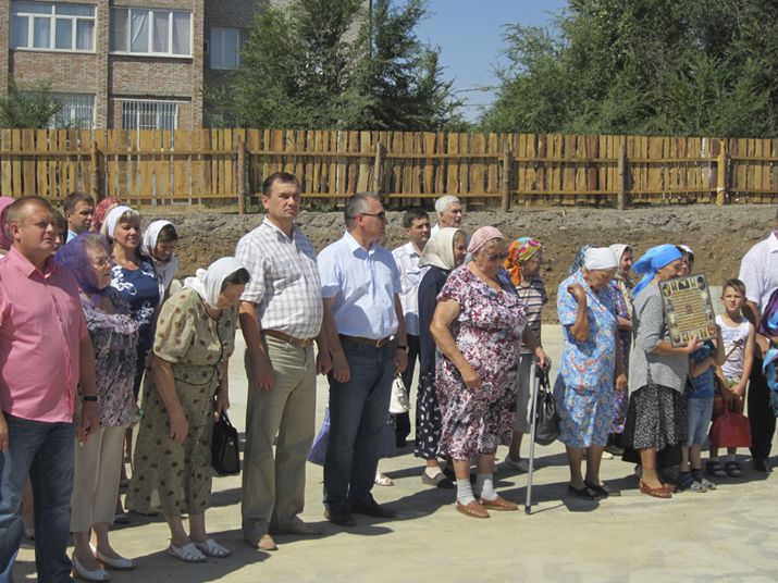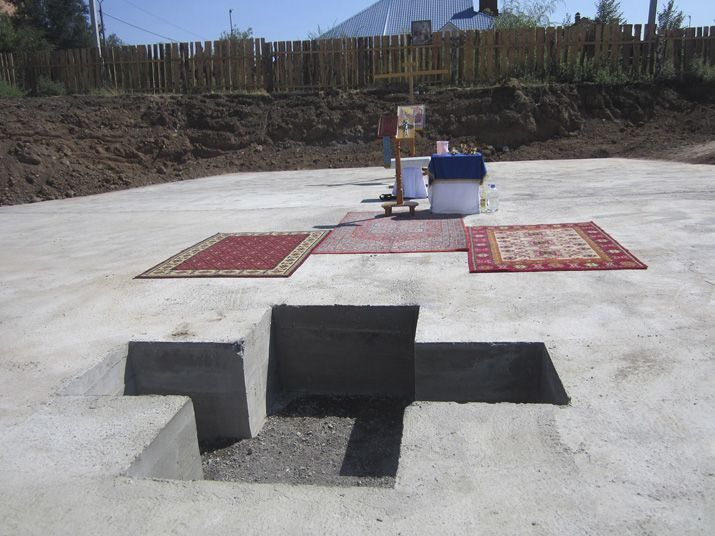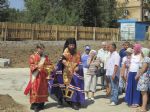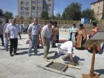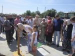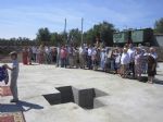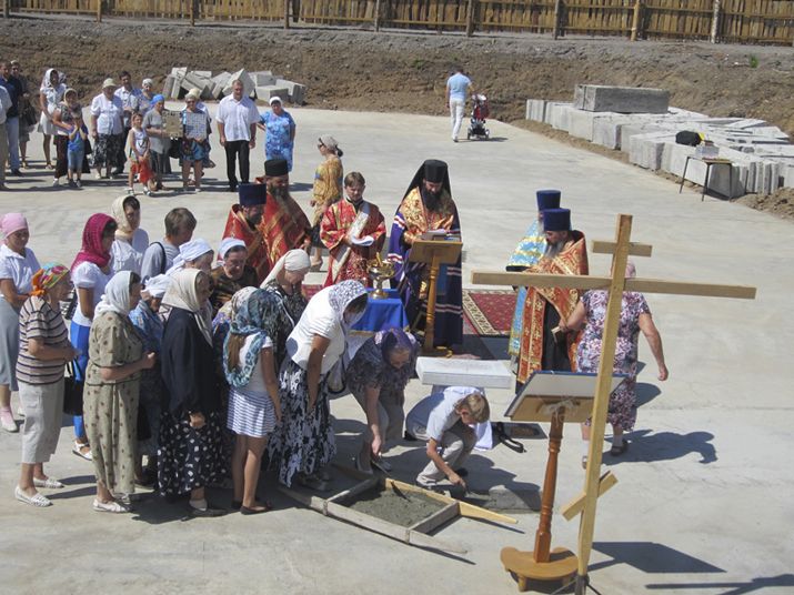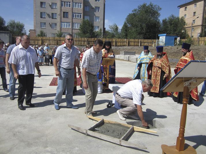 В закладке первого камня над алтарной частью храма приняли участие представители администрации города, благодетели и прихожане, которые укладывали цементный раствор.