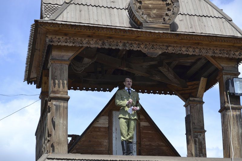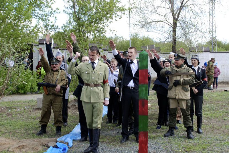 И тут зрителей в буквальном смысле растолкали «немцы», возглавляемые «фюрером». Они освобождали дорогу, распихивая людей и чувствуя себя хозяевами жизни, обладателями «голубой крови», которым подвластно все. Актеры очень живописно продемонстрировали сцены гитлеровской агитации и абсолютной поддержки немцами своего лидера.