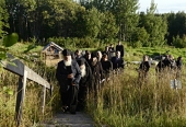 В сопровождении смотрителя пустыни монаха Севастиана (Носовского) Святейший Патриарх Кирилл проследовал к колодцу на месте древнего источника, где совершил молебен святителю Филиппу, митрополиту Московскому.