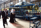 В сопровождении С.А. Смирнова Святейший Патриарх Кирилл посетил цех и ознакомился с процессом сборки на последнем этапе фронтового бомбардировщика Су-34.