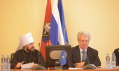 Е.И. Пивовар особо отметил значение трудов митрополита Илариона в различных сферах и напомнил о совместных проектах РГГУ и ОЦАД, среди которых — курсы для епархиальных архивистов, тематические круглые столы и многое другое.