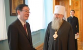 В тот же день состоялась встреча ректора Санкт-Петербургских духовных школ архиепископа Петергофского Амвросия с начальником Государственного управления КНР по делам религий Ван Цзоанем и сопровождающими его директором 4-го департамента ГУДР г-жой Люй Цзиньгуан, директором 3-го департамента ГУДР Ма Цзинем, исполняющей обязанности директора департамента внешних связей ГУДР г-жой Сяо Хун, начальником отдела департамента внешних связей ГУДР г-жой Сюэ Чуньмэй и заместителем начальника канцелярии ГУДР Ли Лянхэ. В ходе беседы, прошедшей в теплой и доброжелательной атмосфере, стороны обсудили широкий круг практических вопросов подготовки Русской Православной Церковью китайских православных студентов.