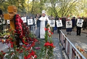 За панихидой, которую отслужил председатель Отдела Московского Патриархата по взаимоотношениям Церкви и общества протоиерей Всеволод Чаплин, молились участники тогдашних событий, в частности, иеромонах Никон (Белавенец) и председатель Комитета памяти жертв трагических событий в Москве в сентябре-октябре 1993 года, депутат Государственной Думы ФС РФ Е.В. Доровин, а также родственники погибших и представители различных общественных объединений. Пели хоры близлежащих храмов святого Иоанна Предтечи на Пресне и святителя Николая на Трех Горах.