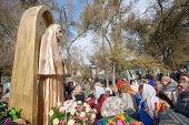 После того, как с памятника был снят белый покров, митрополит Александр прочитал молитву на освящение монумента. Глава Православной Церкви Казахстана окропил скульптурное изображение подвижницы святой водой.
