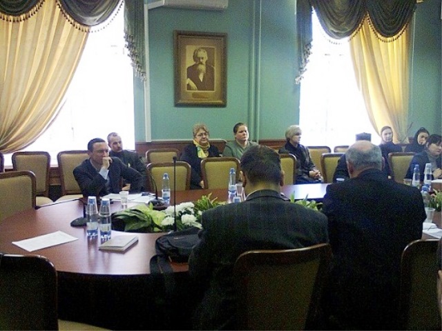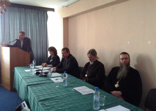 Работа круглого стола началась с молитвы, после чего ведущий круглого стола, заместитель декана социологического факультета В.В.Зырянов обратился к присутствующим с приветственным словом, задав тон последующей дискуссии о проблемных сторонах взаимодействия государственных, церковных и общественных институтов в осуществлении деятельности по духовно-нравственному возрождению России.